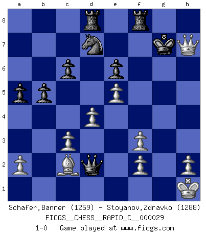 Last move : 1-0 2007 June 7 18:17:43 [Event "FICGS__CHESS__RAPID_C__000029"] [Site "FICGS"] [Date "2007.04.16"] [Round "1"] [White "Schafer,Banner"] [Black "Stoyanov,Zdravko"] [Result "1-0"] [WhiteElo "1259"] [BlackElo "1288"] 1.d4 d5 2.c4 c6 3.e3 Nf6 4.Nf3 Bg4 5.Be2 dxc4 6.Bxc4 e6 7.Nc3 Bb4 8.O-O Bxc3 9.bxc3 Ne4 10.Qd3 Bxf3 11.gxf3 Ng5 12.e4 O-O 13.Bxg5 Qxg5+ 14.Kh1 Nd7 15.Rg1 Qf4 16.Rg4 Qh6 17.e5 b5 18.Bb3 a5 19.Bc2 Rad8 20.Rag1 g6 21.Qe4 Qd2 22.Rxg6+ fxg6 23.Rxg6+ Kf7 24.Rg7+ Kxg7 25.Qxh7+ 1-0 QGD Slav defense Kingside Castling by player White (move 8) Kingside Castling by player Black (move 12) Player White won this chess game. Follow this game move after move (download)A sacrifice is best refuted by accepting it. (Wilhelm Steinitz) Kasparov stellt für gewöhnlich die Regeln auf und bricht sie dann selbst wieder. (Alexej Shirov) Al jugar al Ajedrez entonces, podemos aprender: Primero: Previsión... Segundo: Prudencia... Tercero: Cautela... Y al final, aprendemos del Ajedrez el hábito de no ser desanimados por apariencias malas presentes en el estado de nuestros asuntos, el hábito de la esperanza por una oportunidad favorable y la perseveración de los secretos de los recursos. (Benjamin Franklin) Dans le domaine de la peinture, de la gravure et de la sculpture, dès la première décennie de notre siècle, les artistes abandonnent la représentation de la partie d'échecs pour se concentrer sur les pièces, sur les échiquiers et sur toutes les variations auxquelles les unes et les autres peuvent donner lieu. On passe en quelque sorte d'un thème social à un thème musical (au sens de la musica médiévale, c'est-à-dire d'une notion qui inclue le rythme, l'harmonie, la construction et la déconstruction, etc.). Graphiquement et picturalement, l'échiquier apparaît comme une structure ouverte, dynamique, d'une richesse infinie, autorisant toutes les combinatoires et débouchant sur des mouvements et des rythmes de nature exponentielle. (Michel Pastoureau) Creativity involves breaking out of established patterns in order to look at things in a different way. (Edward De Bono)