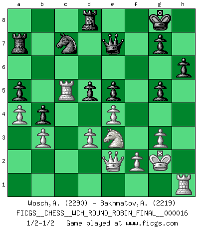 Last move : 1/2-1/2 2018 January 2 7:25:22 [Event "FICGS__CHESS__WCH_ROUND_ROBIN_FINAL__000016"] [Site "FICGS"] [Date "2017.10.14"] [Round "1"] [White "Wosch,Arkadiusz"] [Black "Bakhmatov,Andrey"] [Result "1/2-1/2"] [WhiteElo "2290"] [BlackElo "2219"] 1.e4 e5 2.Nf3 Nc6 3.Bc4 Bc5 4.c3 Nf6 5.d3 O-O 6.O-O d6 7.Re1 a6 8.Bb3 Ba7 9.h3 Re8 10.Nbd2 Be6 11.Nf1 h6 12.Be3 Bxe3 13.Nxe3 Bxb3 14.Qxb3 Qd7 15.a3 Ne7 16.Rad1 Ng6 17.Nh2 Nf4 18.Nhg4 Nxg4 19.hxg4 b5 20.Qc2 c5 21.g3 Ne6 22.Qe2 a5 23.Rb1 f6 24.Kg2 Ra7 25.Rh1 Nc7 26.b3 d5 27.a4 b4 28.cxb4 cxb4 29.Rbc1 Rd8 30.g5 fxg5 31.Rc5 Qe7 1/2-1/2 Giuoco Piano Kingside Castling by player Black (move 5) Kingside Castling by player White (move 6) This chess game ended in a draw. Follow this game move after move (download)My opponents make good moves too. Sometimes I don't take these things into consideration. (Bobby Fischer) Wenn du gegen Bobby spielst, ist es keine Frage von gewinnen oder verlieren. Es ist eine Frage des Überlebens. (Boris Vassilievich Spassky) Yo adoro todas la posiciones. Denme una partida posicional difícil, y la jugaré. Pero posiciones totalmente ganadas, no las tolero. (Hein Donner) Pour se monter efficace, un Cavalier a besoin d'avant-postes ! Les Cavaliers font les meilleurs bloqueurs de pions passés. Employ the attack like tactic of defense. (Chinese proverb)
