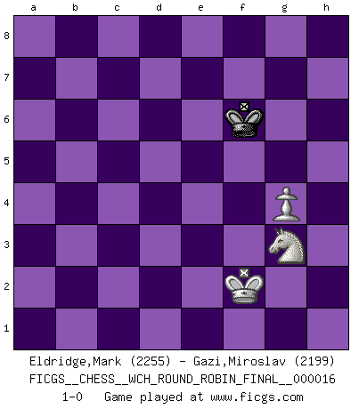 Last move : 1-0 2018 March 21 20:38:49 [Event "FICGS__CHESS__WCH_ROUND_ROBIN_FINAL__000016"] [Site "FICGS"] [Date "2017.10.14"] [Round "1"] [White "Eldridge,Mark"] [Black "Gazi,Miroslav"] [Result "1-0"] [WhiteElo "2255"] [BlackElo "2199"] 1.e4 c5 2.Nf3 d6 3.d4 cxd4 4.Nxd4 Nf6 5.Nc3 a6 6.Be3 e5 7.Nb3 Be6 8.f3 Be7 9.Qd2 h5 10.Be2 Nbd7 11.Nd5 Nxd5 12.exd5 Bf5 13.O-O Rc8 14.c4 Nf6 15.Na5 Qd7 16.Rac1 Bd8 17.h3 O-O 18.b4 Re8 19.Rfe1 h4 20.Nb3 Be7 21.Red1 Nh5 22.c5 Ng3 23.Bc4 g6 24.Re1 Qc7 25.c6 b5 26.Be2 Bf6 27.a4 Rb8 28.axb5 Nxe2+ 29.Qxe2 Rxb5 30.Qd2 Reb8 31.Rc4 Bd8 32.Ra1 Ra8 33.f4 f6 34.fxe5 fxe5 35.Bg5 Qa7+ 36.Kh2 Bb6 37.Rxh4 Qf7 38.Rd1 Rb8 39.Qe2 Rxd5 40.Rf1 Rf8 41.Qxa6 Bc8 42.Rh8+ Kxh8 43.Rxf7 Bxa6 44.Rxf8+ Kg7 45.Ra8 Bd3 46.c7 Bxc7 47.Ra7 Kf7 48.Nc1 Ke6 49.Nxd3 Kd7 50.Nb2 Kc8 51.Na4 e4 52.Bf4 g5 53.Bg3 e3 54.Nc3 Rd2 55.Nb5 Bb8 56.Rg7 Rd5 57.Rg8+ Kb7 58.Nc3 Rd3 59.Ne4 e2 60.Re8 Rd5 61.Nc3 Rd4 62.Nxe2 Rc4 63.Rg8 Bc7 64.Rxg5 Rxb4 65.h4 Bd8 66.Rg7+ Kc6 67.h5 Bf6 68.Rg6 Rb5 69.Rxf6 Rxh5+ 70.Kg1 Rd5 71.Rxd6+ Rxd6 72.Bxd6 Kxd6 73.g4 Ke5 74.Kf2 Kf6 75.Ng3 1-0 Sicilian : Najdorf, Byrne (English) attack Kingside Castling by player White (move 13) Kingside Castling by player Black (move 17) 10 pieces endgame at move 64 : White KRBNPP , Black KRBP WHITE : King + 1 Rook 1 Bishop 1 Knight 2 Pawns BLACK : King + 1 Rook 1 Bishop 1 Pawn 9 pieces endgame at move 69 : White KRBNPP , Black KRP WHITE : King + 1 Rook 1 Bishop 1 Knight 2 Pawns BLACK : King + 1 Rook 1 Pawn 8 pieces endgame at move 69 : White KRBNP , Black KRP WHITE : King + 1 Rook 1 Bishop 1 Knight 1 Pawn BLACK : King + 1 Rook 1 Pawn 7 pieces endgame at move 71 : White KRBNP , Black KR WHITE : King + 1 Rook 1 Bishop 1 Knight 1 Pawn BLACK : King + 1 Rook 6 pieces endgame at move 71 : White KBNP , Black KR WHITE : King + 1 Bishop 1 Knight 1 Pawn BLACK : King + 1 Rook 5 pieces endgame at move 72 : White KBNP , Black K WHITE : King + 1 Bishop 1 Knight 1 Pawn BLACK : King + 4 pieces endgame at move 72 : White KNP , Black K WHITE : King + 1 Knight 1 Pawn BLACK : King + Player White won this chess game. Follow this game move after move (download)Different people feel differently about resigning. (Bobby Fischer) Capablanka war das größte Genie der Schachgeschichte! Aber denken sie nicht er habe nichts vom Schach verstanden. Er wusste nur soviel wie er wissen musste um seine Ziele zu erreichen. (Mikhail Moiseyevich Botvinik) Peones: ellos son el alma de esta partida, solos forman el ataque y la defensa. (Philidor) L'ordinateur a tué l'originalité. Il n'y a plus guère d'aventures sur l'échiquier. (Jacob Murray) Secret operations are essential in war; upon them the army relies to make its every move. (Sun Tzu)