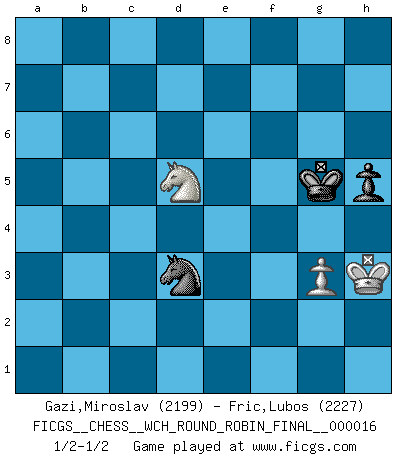 Last move : 1/2-1/2 2018 April 17 14:18:48 [Event "FICGS__CHESS__WCH_ROUND_ROBIN_FINAL__000016"] [Site "FICGS"] [Date "2017.10.14"] [Round "1"] [White "Gazi,Miroslav"] [Black "Fric,Lubos"] [Result "1/2-1/2"] [WhiteElo "2199"] [BlackElo "2227"] 1.d4 Nf6 2.c4 e6 3.Nf3 d5 4.g3 Bb4+ 5.Nbd2 O-O 6.Bg2 b6 7.O-O Bb7 8.Ne5 Nc6 9.Ndf3 Nxe5 10.Nxe5 Be7 11.b3 c5 12.Bb2 Qc7 13.dxc5 bxc5 14.e3 Rfd8 15.Qe2 a5 16.Rac1 Bf8 17.Rfe1 a4 18.b4 dxc4 19.bxc5 Bxg2 20.Kxg2 a3 21.Bd4 Bxc5 22.Bxc5 Qxc5 23.Nxc4 h5 24.h4 g6 25.Rc2 Nd5 26.Rd1 Nb4 27.Rcd2 Qc6+ 28.e4 Rxd2 29.Rxd2 Qb5 30.e5 Nd5 31.Qd3 Kg7 32.Kh2 Kf8 33.Kh3 Kg7 34.Nd6 Qxd3 35.Rxd3 Nb4 36.Rb3 Nxa2 37.Nc4 Ra4 38.Nxa3 Re4 39.f4 Nc1 40.Rb7 Nd3 41.Nb5 Rb4 42.Nd6 Rxb7 43.Nxb7 f6 44.exf6+ Kxf6 45.Nd6 e5 46.fxe5+ Nxe5 47.Ne4+ Ke6 48.Nc3 Kf5 49.Ne2 Nd3 50.Nc3 g5 51.hxg5 Kxg5 52.Nd5 1/2-1/2 Queen's pawn game Kingside Castling by player Black (move 5) Kingside Castling by player White (move 7) 10 pieces endgame at move 44 : White KNPPP , Black KNPPP WHITE : King + 1 Knight 3 Pawns BLACK : King + 1 Knight 3 Pawns 9 pieces endgame at move 46 : White KNPPP , Black KNPP WHITE : King + 1 Knight 3 Pawns BLACK : King + 1 Knight 2 Pawns 8 pieces endgame at move 46 : White KNPP , Black KNPP WHITE : King + 1 Knight 2 Pawns BLACK : King + 1 Knight 2 Pawns 7 pieces endgame at move 51 : White KNPP , Black KNP WHITE : King + 1 Knight 2 Pawns BLACK : King + 1 Knight 1 Pawn 6 pieces endgame at move 51 : White KNP , Black KNP WHITE : King + 1 Knight 1 Pawn BLACK : King + 1 Knight 1 Pawn This chess game ended in a draw. Follow this game move after move (download)I believe that Chess possesses a magic that is also a help in advanced age. A rheumatic knee is forgotten during a game of Chess and other events can seem quite unimportant in comparison with a catastrophe on the chessboard. (Vlastimil Hort) Frage: Gibt es etwas was Sie mehr lieben als Autobahnen ohne Tempobegrenzungen? - Antwort: Deutsche Frauen ohne Tempobegrenzungen. (Loek van Wely) Jugadores de primera clase pierden en contra de jugadores de segunda clase porque los jugadores de segunda clase a veces juegan una partida de primer clase. (Siegbert Tarrasch) 'L'échange des dames est un coup dur pour les deux adversaires...' Un journaliste lors d'une partie du match Spassky-Fischer Indecision is the key to flexibility. (Unknown)