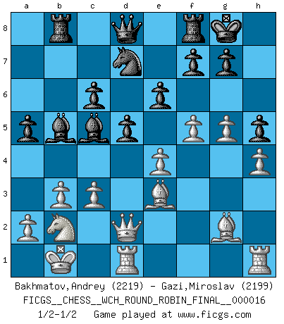 Last move : 1/2-1/2 2018 January 16 7:38:0 [Event "FICGS__CHESS__WCH_ROUND_ROBIN_FINAL__000016"] [Site "FICGS"] [Date "2017.10.14"] [Round "1"] [White "Bakhmatov,Andrey"] [Black "Gazi,Miroslav"] [Result "1/2-1/2"] [WhiteElo "2219"] [BlackElo "2199"] 1.e4 c5 2.Nf3 d6 3.d4 cxd4 4.Nxd4 Nf6 5.Nc3 a6 6.h3 e6 7.g4 h6 8.Bg2 Be7 9.Be3 Nc6 10.Nxc6 bxc6 11.Qd2 d5 12.O-O-O Rb8 13.Kb1 Nd7 14.b3 O-O 15.Na4 a5 16.f4 Ba6 17.h4 Bb5 18.Nb2 Bb4 19.c3 Bc5 20.g5 h5 21.f5 1/2-1/2 Sicilian : Najdorf, Adams attack Queenside Castling by player White (move 12) Kingside Castling by player Black (move 14) This chess game ended in a draw. Follow this game move after move (download)Chess demands total concentration. (Bobby Fischer) Schach ist ein Reich, wo sich die menschliche Phantasie frei entfalten kann. (David Bronstein) Yo no le temo a Spassky. Todos saben que yo soy el mejor. Uno no necesita un torneo para probarlo. (Bobby Fischer) Les échecs, c'est l'art d'analyser. (Mikhail Botvinnik) The difference between stupidity and genius is that genius has its limits. (Murphy)