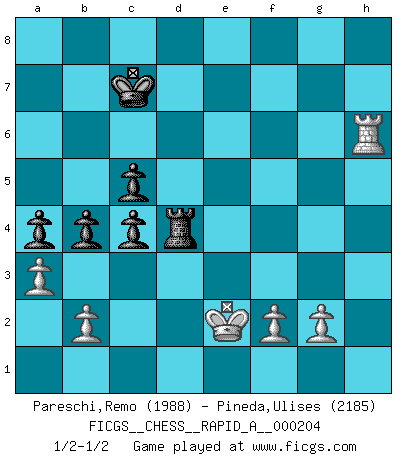 Last move : 1/2-1/2 2018 March 26 15:31:35 [Event "FICGS__CHESS__RAPID_A__000204"] [Site "FICGS"] [Date "2017.10.26"] [Round "1"] [White "Pareschi,Remo"] [Black "Pineda,Ulises"] [Result "1/2-1/2"] [WhiteElo "1988"] [BlackElo "2185"] 1.d4 d5 2.c4 e6 3.Nc3 c6 4.Nf3 Nf6 5.Bg5 h6 6.Bh4 dxc4 7.e4 g5 8.Bg3 b5 9.Ne5 Bb7 10.h4 g4 11.Nxg4 Nxg4 12.Qxg4 Qxd4 13.Rd1 Qg7 14.Qf4 Na6 15.Be2 Nc5 16.O-O e5 17.Qxe5+ Qxe5 18.Bxe5 Rg8 19.Rfe1 Be7 20.Bf4 Bxh4 21.Be3 Be7 22.e5 Rd8 23.Bxc5 Bxc5 24.Ne4 Be7 25.Nd6+ Bxd6 26.exd6 Kf8 27.Bf3 Rg6 28.d7 Re6 29.Bg4 Re7 30.Rxe7 Kxe7 31.Re1+ Kd6 32.Re8 Kc7 33.Re7 c5 34.Rxf7 Bc6 35.Kf1 a5 36.Rh7 Rg8 37.Bh3 Rg6 38.Rh8 Bxd7 39.Rh7 Rd6 40.Ke2 a4 41.Bxd7 Rxd7 42.Rxh6 b4 43.a3 Rd4 1/2-1/2 QGD : Semi-Slav Kingside Castling by player White (move 16) This chess game ended in a draw. Follow this game move after move (download)There are two classes of men; those who are content to yield to circumstances and who play whist; those who aim to control circumstances, and who play Chess. (Mortimer Collins) Strategie ist, wie man ein Mädchen auf den Rücksitz bekommt. Taktik ist, was man tut, wenn man dann dort ist. (Anonymous) Una de estas pequeñas movidas modestas pudieran ser mas molestas a tu oponente que la amenaza mas grande. (Siegbert Tarrasch) Ce n'est pas pour s'amuser qu'il joue aux échecs : il célèbre un culte. (Vladimir Nabokov) How many people work in NATO Headquarters ? - About half of them. (Dirk Stikker, NATO general secretary)