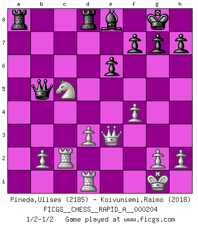Last move : 1/2-1/2 2018 February 12 13:52:15 [Event "FICGS__CHESS__RAPID_A__000204"] [Site "FICGS"] [Date "2017.10.26"] [Round "1"] [White "Pineda,Ulises"] [Black "Koivuniemi,Raimo"] [Result "1/2-1/2"] [WhiteElo "2185"] [BlackElo "2018"] 1.e4 c5 2.Nf3 Nc6 3.Nc3 e6 4.d4 cxd4 5.Nxd4 Qc7 6.Be3 a6 7.f4 b5 8.Nb3 Nf6 9.a3 b4 10.axb4 Nxb4 11.Bd3 Bb7 12.O-O Rb8 13.Ba7 Nxd3 14.cxd3 Rc8 15.Na4 Bc6 16.Bd4 Be7 17.Nac5 O-O 18.Nxa6 Qb7 19.Nbc5 Qb5 20.Qd2 d6 21.e5 dxc5 22.exf6 cxd4 23.fxe7 Rfe8 24.Rfc1 Rxe7 25.Qb4 Qb7 26.Qxd4 R7e8 27.Nc5 Qb5 28.Rc2 Red8 29.Qe3 Be8 30.Rd1 Ra8 1/2-1/2 Sicilian defense Kingside Castling by player White (move 12) Kingside Castling by player Black (move 17) This chess game ended in a draw. Follow this game move after move (download)Fischer was a master of clarity and a king of artful positioning. His opponents would see where he was going but were powerless to stop him. (Bruce Pandolfini) Bis jetzt ist Weiß einer wohlbekannten Analyse gefolgt. Aber jetzt begeht er einen schrecklichen Fehler: Er beginnt seinen eigenen Kopf zu benutzen. (Siegbert Tarrasch) Los errores estan ahí, esperando a que se cometan. (Savielly Tartakower) Vous savez, camarade Pachman, je n'éprouve pas de plaisir à être ministre, je jouerais plutôt aux échecs comme vous, ou alors ferais une révolution au Venezuela. (Che Guevara à Ludek Pachman, 'Checkmate in Prague', 1975) The message for business people contemplating their place in the cyberspace is simple and direct: get linked or get lost. (Vic Sussman and Kenan Pollack)