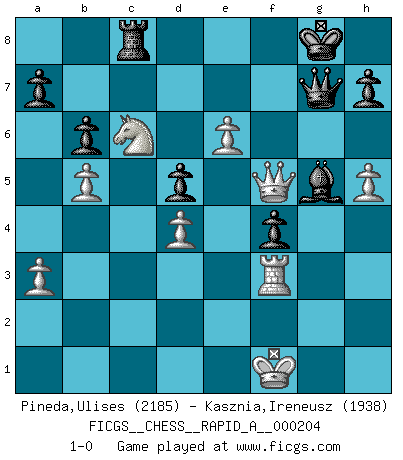 Last move : 1-0 2018 January 6 10:37:15 [Event "FICGS__CHESS__RAPID_A__000204"] [Site "FICGS"] [Date "2017.10.26"] [Round "1"] [White "Pineda,Ulises"] [Black "Kasznia,Ireneusz"] [Result "1-0"] [WhiteElo "2185"] [BlackElo "1938"] 1.e4 e6 2.d4 d5 3.Nc3 Nf6 4.e5 Nfd7 5.f4 c5 6.Nf3 Nc6 7.Be3 Qb6 8.Na4 Qa5+ 9.c3 cxd4 10.b4 Qc7 11.Nxd4 Nxd4 12.Bxd4 b6 13.Bd3 Be7 14.O-O O-O 15.a3 g6 16.Rc1 Bb7 17.Qg4 Rae8 18.h4 f5 19.Qh3 Nb8 20.h5 g5 21.g4 Nc6 22.b5 Nxd4 23.cxd4 Qd8 24.gxf5 exf5 25.Bxf5 Kh8 26.Kh1 gxf4 27.Rf3 Bg5 28.Nb2 Rxf5 29.Qxf5 Rf8 30.Qg4 Bc8 31.e6 Re8 32.Rc6 Qf6 33.Rxc8 Rxc8 34.Nd3 Rc3 35.Kg2 Rc2+ 36.Kf1 Qg7 37.Ne5 Kg8 38.Qf5 Rc8 39.Nc6 1-0 French : Steinitz, Boleslavsky variation Kingside Castling by player White (move 14) Kingside Castling by player Black (move 14) Player White won this chess game. Follow this game move after move (download)Openings teach you openings. Endgames teach you chess ! (Stephan Gerzadowicz) Der zweitbeste Zug ist oft der einzig richtige. (Savielly Grigorievitsch Tartakower) Si tu oponente te ofrece un empate, trata de averiguar porque piensa él que esta en una posición peor. (Nigel Short) La victoire dans une partie d'Echecs appartient la plupart du temps à celui qui voit un peu plus loin que l'adversaire. (Lasker) Always two there are. No more no less. A master, and an apprentice. (Master Yoda in Star Wars ep.1)