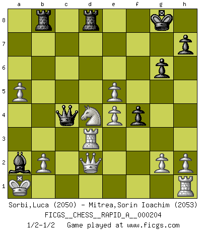 Last move : 1/2-1/2 2018 January 19 17:3:31 [Event "FICGS__CHESS__RAPID_A__000204"] [Site "FICGS"] [Date "2017.10.26"] [Round "1"] [White "Sorbi,Luca"] [Black "Mitrea,Sorin Ioachim"] [Result "1/2-1/2"] [WhiteElo "2050"] [BlackElo "2053"] 1.e4 c5 2.Nf3 d6 3.d4 cxd4 4.Nxd4 Nf6 5.Nc3 g6 6.Be3 Bg7 7.f3 O-O 8.Qd2 Nc6 9.Bc4 Bd7 10.O-O-O Rb8 11.Bb3 Na5 12.Bh6 Bxh6 13.Qxh6 e5 14.Nde2 b5 15.Rxd6 b4 16.Nd5 Nxb3+ 17.axb3 Nxd5 18.Rxd5 Qc7 19.Kb1 Be6 20.Rd3 a5 21.f4 f5 22.fxe5 a4 23.bxa4 b3 24.cxb3 Bxb3 25.Nd4 Qc4 26.Qe3 f4 27.Qd2 Rfd8 28.a5 Ba2+ 29.Ka1 1/2-1/2 Sicilian : Dragon, Yugoslav attack, 7...O-O Kingside Castling by player Black (move 7) Queenside Castling by player White (move 10) This chess game ended in a draw. Follow this game move after move (download)In complicated positions, Bobby Fischer hardly had to be afraid of anybody. (Paul Keres) Kritik überlasse ich den Spießern. Ich zeige nichts, wofür ich mich schämen muss. (Alexandra Kosteniuk) De eso se trata el Ajedrez. Un día le das una lección a tu oponente y al día siguiente el te da una a tí. (Bobby Fischer) Les écrivains ont utilisé les échecs pour analyser les côtés extrêmes de la nature humaine. Dans ce cadre, les échecs offrent un champ d'expérimentation idéal. Mais on pourrait faire la même chose avec la peinture. Et là, en vous référant à Van Gogh, vous ne tirerez pas de conclusion définitive sur les peintres. (Gary Kasparov) It is not enough to be a good player... you must also play well. (Siegbert Tarrasch)