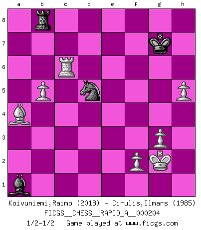 Last move : 1/2-1/2 2018 April 11 10:1:20 [Event "FICGS__CHESS__RAPID_A__000204"] [Site "FICGS"] [Date "2017.10.26"] [Round "1"] [White "Koivuniemi,Raimo"] [Black "Cirulis,Ilmars"] [Result "1/2-1/2"] [WhiteElo "2018"] [BlackElo "1985"] 1.c4 e6 2.Nc3 c5 3.e3 d5 4.d4 cxd4 5.exd4 dxc4 6.Nf3 Nf6 7.Bxc4 Be7 8.O-O O-O 9.Re1 Nc6 10.a3 b6 11.Ba2 Bb7 12.Bf4 h6 13.Qd2 Bd6 14.Bxh6 gxh6 15.d5 Ne7 16.dxe6 Bxf3 17.Qxh6 Bd5 18.Nxd5 Nexd5 19.Rad1 Bf4 20.Qh3 fxe6 21.Qxe6+ Kh7 22.Rxd5 Qc7 23.g3 Bh6 24.Bb1+ Kh8 25.Qh3 Qg7 26.Rd6 Rad8 27.R1e6 Rxd6 28.Rxd6 Rf7 29.Bd3 Ng8 30.Bc4 Rf6 31.Rd7 Qf8 32.Qf1 Rd6 33.Rxa7 Qf3 34.Rf7 Qg4 35.Bb3 Nf6 36.Qa6 Qe4 37.Qc8+ Qe8 38.Qb7 Qe1+ 39.Kg2 Qe4+ 40.Qxe4 Nxe4 41.Bc2 Nf6 42.b4 b5 43.h4 Bc1 44.a4 bxa4 45.Bxa4 Rb6 46.b5 Nd5 47.Rf8+ Kg7 48.Rc8 Bb2 49.Rc2 Ba1 50.Rc6 Rb8 51.h5 1/2-1/2 English Opening Kingside Castling by player White (move 8) Kingside Castling by player Black (move 8) This chess game ended in a draw. Follow this game move after move (download)I played Chess with him and would have beaten him sometimes only he always took back his last move, and ran the game out differently. (Mark Twain) Wie gewinnt Tal? Er entwickelt alle seine Figuren in die Brettmitte und opfert sie dann irgendwo. (Robert James Fischer) Un sacrificio se refuta mucho mejor al aceptarlo. (Wilhelm Steinitz) Ne tendez aucun piège pour le plaisir ! Ne jouez rien dans l'espoir que l'adversaire réagisse de façon stupide ! Prenez toujours pour acquis que l'adversaire va trouver le meilleur coup ! Ne jouez jamais de coup dans l'espoir que l'adversaire ne voie pas la menace ! Chacun de vos coups doit améliorer la position d'une façon ou d'une autre. There are two kinds of people in the world, my friend. Those who have a loaded gun and those who dig. You dig ! (Blondie in The Good, The Bad and The Ugly)