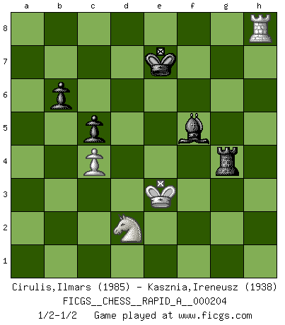 Last move : 1/2-1/2 2017 December 16 21:0:52 [Event "FICGS__CHESS__RAPID_A__000204"] [Site "FICGS"] [Date "2017.10.26"] [Round "1"] [White "Cirulis,Ilmars"] [Black "Kasznia,Ireneusz"] [Result "1/2-1/2"] [WhiteElo "1985"] [BlackElo "1938"] 1.b4 e5 2.a3 d5 3.Bb2 Nd7 4.e3 a5 5.c4 axb4 6.axb4 Rxa1 7.Bxa1 Bxb4 8.cxd5 Ngf6 9.Nf3 O-O 10.Qb3 Qe7 11.Be2 e4 12.Bxf6 Nxf6 13.Nd4 Qc5 14.Nc3 Bxc3 15.Qxc3 Qxc3 16.dxc3 Nxd5 17.Kd2 c5 18.Nb3 b6 19.Rb1 f5 20.Ra1 Kf7 21.Bc4 Be6 22.Ra7+ Kg6 23.Rb7 Rd8 24.Bxd5 Rxd5+ 25.Ke1 Rd6 26.Nd2 Bd5 27.Rc7 Kf6 28.h4 h6 29.Ra7 Be6 30.Rb7 g6 31.Ke2 Bc8 32.Rb8 Bd7 33.f3 exf3+ 34.gxf3 Be6 35.f4 g5 36.hxg5+ hxg5 37.fxg5+ Kxg5 38.Rf8 Kg6 39.e4 Kg7 40.Rb8 Kf6 41.exf5 Kxf5 42.Rf8+ Ke5 43.Ke3 Bd5 44.c4 Bc6 45.Rb8 Bd7 46.Ne4 Rg6 47.Rh8 Rg4 48.Rh5+ Bf5 49.Nd2 Kf6 50.Rh8 Ke7 1/2-1/2 Polish (Sokolsky) opening Kingside Castling by player Black (move 9) 10 pieces endgame at move 41 : White KRNPP , Black KRBPP WHITE : King + 1 Rook 1 Knight 2 Pawns BLACK : King + 1 Rook 1 Bishop 2 Pawns 9 pieces endgame at move 41 : White KRNP , Black KRBPP WHITE : King + 1 Rook 1 Knight 1 Pawn BLACK : King + 1 Rook 1 Bishop 2 Pawns This chess game ended in a draw. Follow this game move after move (download)Chess is in its essence a game, in its form an art, and in its execution a science. (Baron Tassilo) Ein Schachspiel besteht aus drei Phasen: Die erste, wenn du hofftst den Vorteil zu haben, die zweite, wenn du glaubst einen Vorteil zu haben, und die dritte.... wenn du weißt Du wirst verlieren. (Savielly Grigorievitsch Tartakower) El Ajedrez se juega con la mente... ¡no con las manos!. (Renaud y Kahn) 'L'échange des dames est un coup dur pour les deux adversaires...' Un journaliste lors d'une partie du match Spassky-Fischer The only difference between a tax man and a taxidermist is that the taxidermist leaves the skin. (Mark Twain)