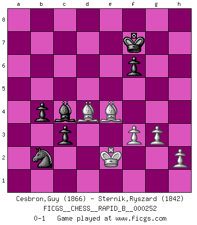 Last move : 0-1 2018 January 26 13:19:0 [Event "FICGS__CHESS__RAPID_B__000252"] [Site "FICGS"] [Date "2017.10.28"] [Round "1"] [White "Cesbron,Guy"] [Black "Sternik,Ryszard"] [Result "0-1"] [WhiteElo "1866"] [BlackElo "1842"] 1.c4 Nf6 2.Nc3 e5 3.Nf3 Nc6 4.g3 d5 5.cxd5 Nxd5 6.Bg2 Nb6 7.O-O Be7 8.d3 O-O 9.Be3 Bg4 10.Rc1 Re8 11.d4 exd4 12.Nxd4 Nxd4 13.Bxd4 c6 14.Qd3 Qd7 15.Rfd1 Rad8 16.f3 Bf5 17.Ne4 Qe6 18.Qb3 Qxb3 19.axb3 Be6 20.Nc5 Bxc5 21.Bxc5 Bxb3 22.Rxd8 Rxd8 23.Ra1 Na4 24.Bxa7 Nxb2 25.Rb1 Rd2 26.Be3 Rd1+ 27.Rxd1 Bxd1 28.Kf2 Nc4 29.Ba7 f6 30.e4 Kf7 31.Bf1 Nb2 32.Bd4 Na4 33.e5 b5 34.exf6 gxf6 35.Bd3 c5 36.Be3 b4 37.Ke1 Bb3 38.Bxh7 Bd5 39.Kd2 c4 40.Bd4 c3+ 41.Kd3 Bb3 42.Be4 Nb2+ 43.Ke2 Bc4+ 0-1 English Opening Kingside Castling by player White (move 7) Kingside Castling by player Black (move 8) Player Black won this chess game. Follow this game move after move (download)If Chess is a science, it's a most inexact one. If Chess is an art, it is too exacting to be seen as one. If Chess is a sport, it's too esoteric. If Chess is a game, it's too demanding to be just a game. If Chess is a mistress, she's a demanding one. If Chess is a passion, it's a rewarding one. If Chess is life, it's a sad one. (Unknown) Capablanka war das größte Genie der Schachgeschichte! Aber denken sie nicht er habe nichts vom Schach verstanden. Er wusste nur soviel wie er wissen musste um seine Ziele zu erreichen. (Mikhail Moiseyevich Botvinik) El Ajedrez es sobre todo, ¡una pelea!. (Emanuel Lasker) Aucun coup ne doit être joué sans but. (Pedro Damiano) Somewhere in the world there is an epigram for every dilemma. (Hendrik Willem van Loon)
