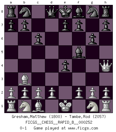 Last move : 0-1 2017 December 2 18:55:27 [Event "FICGS__CHESS__RAPID_B__000252"] [Site "FICGS"] [Date "2017.10.28"] [Round "1"] [White "Gresham,Matthew"] [Black "Tambe,Rod"] [Result "0-1"] [WhiteElo "1800"] [BlackElo "2057"] 1.e4 c6 2.Bc4 d5 3.Bb3 dxe4 4.Qh5 g6 5.Qh4 Bf5 0-1 This chess game has been lost on time (started : 2017.10.28 0:51:18) Caro-Kann : Hillbilly attack Player Black won this chess game. Follow this game move after move (download)The blunders are all there on the board, waiting to be made. (Savielly Tartakover) Ein Teil des Fehlers ist immer korrekt. (Savielly Grigorievitsch Tartakower) La vida es como el Ajedrez, con lucha, competición y eventos buenos y malos. (Benjamin Franklin) Le profane ne songe pas à la somme de jouissance dont il se prive, qui méconnaît ce jeu aux ressources aussi variées que passionnantes. (Jean-Marie Jeanton-Lamarche) Fortune favours the audacious. (Desiderius Erasmus)