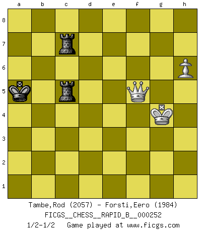 Last move : 1/2-1/2 2018 February 4 19:4:0 [Event "FICGS__CHESS__RAPID_B__000252"] [Site "FICGS"] [Date "2017.10.28"] [Round "1"] [White "Tambe,Rod"] [Black "Forsti,Eero"] [Result "1/2-1/2"] [WhiteElo "2057"] [BlackElo "1984"] 1.e4 d5 2.exd5 Qxd5 3.Nf3 Bg4 4.Be2 Nc6 5.d4 O-O-O 6.c4 Qf5 7.Be3 Bxf3 8.Bxf3 Nxd4 9.Bxd4 Qe6+ 10.Be2 Qe4 11.O-O Qxd4 12.Qa4 e6 13.Nc3 Bd6 14.Nb5 Qe5 15.Nxd6+ cxd6 16.Bf3 Kb8 17.Rfe1 Qc5 18.b4 Qc7 19.c5 Ne7 20.Rac1 dxc5 21.bxc5 Nd5 22.g3 g5 23.Rc2 Qc6 24.Qa3 Rc8 25.Rb1 Rc7 26.Rcb2 Ka8 27.Rb5 Qe8 28.R1b3 Qc8 29.Ra5 Qb8 30.Qa4 Rc6 31.Rab5 h6 32.Rxb7 Qxb7 33.Rxb7 Kxb7 34.Bh5 Rc7 35.Qb5+ Ka8 36.Bf3 Rd8 37.Kg2 Rdc8 38.Qd3 f5 39.Bxd5+ exd5 40.Qxd5+ Rc6 41.h4 gxh4 42.gxh4 a6 43.Kh3 Ka7 44.Qxf5 R8c7 45.Qh5 Rf6 46.f3 Rg7 47.Qd5 Rfg6 48.Qd2 Rg3+ 49.Kh2 Rxf3 50.Qb2 Rgf7 51.Qb6+ Ka8 52.Qxa6+ Kb8 53.Qb6+ Ka8 54.Qxh6 Rf2+ 55.Kg3 R2f3+ 56.Kg4 R3f6 57.Qg5 Ka7 58.h5 Rc6 59.a4 Rfc7 60.Qe3 Kb8 61.Qe8+ Ka7 62.a5 Rxc5 63.h6 Rc3 64.Qe6 R3c6 65.Qe3+ Kb7 66.Qe4 Ka6 67.Qe2+ Ka7 68.Qe3+ Kb8 69.Qe8+ Kb7 70.Qe4 Ka6 71.Qd3+ Kxa5 72.Qf5+ Rc5 1/2-1/2 Scandinavian (centre counter) defense Queenside Castling by player Black (move 5) Kingside Castling by player White (move 11) 10 pieces endgame at move 49 : White KQPPP , Black KRRPP WHITE : King + 1 Queen 3 Pawns BLACK : King + 2 Rooks 2 Pawns 9 pieces endgame at move 52 : White KQPPP , Black KRRP WHITE : King + 1 Queen 3 Pawns BLACK : King + 2 Rooks 1 Pawn 8 pieces endgame at move 54 : White KQPPP , Black KRR WHITE : King + 1 Queen 3 Pawns BLACK : King + 2 Rooks 7 pieces endgame at move 62 : White KQPP , Black KRR WHITE : King + 1 Queen 2 Pawns BLACK : King + 2 Rooks 6 pieces endgame at move 71 : White KQP , Black KRR WHITE : King + 1 Queen 1 Pawn BLACK : King + 2 Rooks This chess game ended in a draw. Follow this game move after move (download)I'm not a materialistic person, in that, I don't suffer the lack or loss of money. The absence of worldly goods I don't look back on. For Chess is a way I can be as materialistic as I want without having to sell my soul. (Jamie Walter Adams) Die jungen Leute sollen verstehen, dass sie noch etwas von mir lernen können und müssen. (Viktor Kortschnoi) Aún deseo matar a Fischer. (Boris Spassky) Dans le domaine de la peinture, de la gravure et de la sculpture, dès la première décennie de notre siècle, les artistes abandonnent la représentation de la partie d'échecs pour se concentrer sur les pièces, sur les échiquiers et sur toutes les variations auxquelles les unes et les autres peuvent donner lieu. On passe en quelque sorte d'un thème social à un thème musical (au sens de la musica médiévale, c'est-à-dire d'une notion qui inclue le rythme, l'harmonie, la construction et la déconstruction, etc.). Graphiquement et picturalement, l'échiquier apparaît comme une structure ouverte, dynamique, d'une richesse infinie, autorisant toutes les combinatoires et débouchant sur des mouvements et des rythmes de nature exponentielle. (Michel Pastoureau) The absolute truth is the thing that makes people laugh. (Carl Reiner)