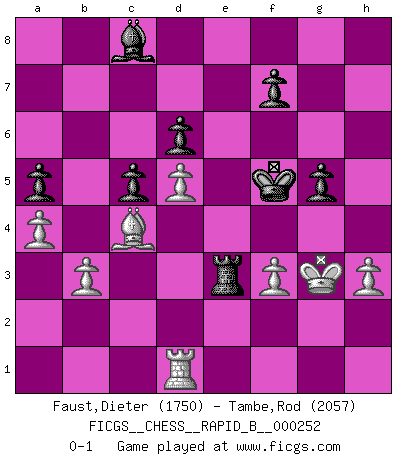 Last move : 0-1 2018 February 6 16:0:14 [Event "FICGS__CHESS__RAPID_B__000252"] [Site "FICGS"] [Date "2017.10.28"] [Round "1"] [White "Faust,Dieter"] [Black "Tambe,Rod"] [Result "0-1"] [WhiteElo "1750"] [BlackElo "2057"] 1.Nf3 g6 2.e4 Bg7 3.d4 d6 4.Nc3 a6 5.Be2 Nf6 6.a4 O-O 7.O-O Nc6 8.h3 e5 9.Be3 exd4 10.Nxd4 Re8 11.Nxc6 bxc6 12.Re1 Nxe4 13.Nxe4 Rxe4 14.Bf3 Rc4 15.b3 Rc3 16.Bd2 Bd7 17.Bxc3 Bxc3 18.Re2 Bxa1 19.Qxa1 d5 20.Qe5 a5 21.Re3 Be6 22.Rc3 Bd7 23.Re3 Rc8 24.c4 Be6 25.Rd3 Qd6 26.Qxd6 cxd6 27.cxd5 Bf5 28.Rd2 c5 29.Be2 g5 30.Bb5 h5 31.Re2 Kg7 32.f3 h4 33.Kf2 Kf6 34.Bc4 Rb8 35.Bb5 Rb7 36.Re1 Re7 37.Rc1 Re5 38.Bc4 Bc8 39.Rd1 Kf5 40.g3 hxg3+ 41.Kxg3 Re3 0-1 Reti Opening Kingside Castling by player Black (move 6) Kingside Castling by player White (move 7) Player Black won this chess game. Follow this game move after move (download)A player surprised is half beaten. (Proverb) Kann Schach nicht schließlich das Nationalspiel der Deutschen werden? Und welche weiteren Ausblicke bieten sich dann dar! Welche Hebung des allgemeinen Kultur-Niveaus, ja der Moral, wenn das Schachbrett den Kartentisch verdrängen würde! Wahrlich, ein Ziel, des Schweißes der Edlen wert! (Siegbert Tarrasch) ¿Que sería del Ajedrez sin errores graciosos?. (Kurt Richter) Les échecs, c'est l'imagination. (David Bronstein) To err is human, but to really foul things up requires a computer. (Farmer's Almanac, 1978)
