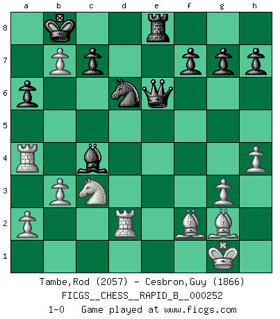 Last move : 1-0 2017 December 26 1:12:10 [Event "FICGS__CHESS__RAPID_B__000252"] [Site "FICGS"] [Date "2017.10.28"] [Round "1"] [White "Tambe,Rod"] [Black "Cesbron,Guy"] [Result "1-0"] [WhiteElo "2057"] [BlackElo "1866"] 1.e4 e5 2.Nf3 Nc6 3.d4 exd4 4.Nxd4 Bc5 5.Be3 Qf6 6.c3 Nge7 7.g3 d5 8.Bg2 dxe4 9.O-O Bxd4 10.cxd4 Bf5 11.Nc3 O-O-O 12.f3 exf3 13.Qxf3 Be6 14.Qd1 Qg6 15.d5 Rhe8 16.dxc6 Rxd1 17.cxb7+ Kb8 18.Raxd1 a6 19.Rf4 Bg4 20.R1d4 Be6 21.Rd2 Nf5 22.Bf2 Nd6 23.Ra4 Bc4 24.h4 Qe6 25.b3 1-0 Scotch game Kingside Castling by player White (move 9) Queenside Castling by player Black (move 11) Player White won this chess game. Follow this game move after move (download)Of all my Russian books, the defense contains and diffuses the greatest 'warmth' which may seem odd seeing how supremely abstract Chess is supposed to be. (Vladimir Nabokov) Schach ist Krieg, im Schach geht es um testosterongesteuerte Urschreie. (Garry Kasparov) Del Ajedrez se ha dicho que la vida no es lo suficientemente larga para él, pero eso es culpa de la vida, no del Ajedrez. (William Ewart Napier) Les Echecs ne sont pas pour les âmes timides. Ils requièrent un homme entier, qui ne s'arrête pas aveuglément à ce qui a été déjà établi, mais qui tente individuellement de sonder les profondeurs du jeu. (W. Steinitz) I believe in luck. How else can you explain the success of those you dislike ? (Jean Cocteau)