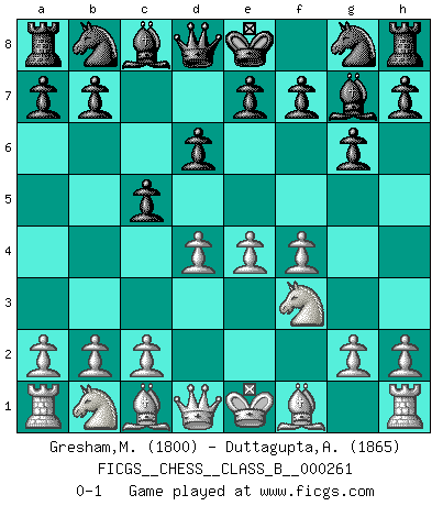 Last move : 0-1 2017 December 10 7:40:57 [Event "FICGS__CHESS__CLASS_B__000261"] [Site "FICGS"] [Date "2017.10.30"] [Round "1"] [White "Gresham,Matthew"] [Black "Duttagupta,Aniruddha"] [Result "0-1"] [WhiteElo "1800"] [BlackElo "1865"] 1.e4 d6 2.d4 g6 3.f4 Bg7 4.Nf3 c5 0-1 This chess game has been lost on time (started : 2017.10.30 18:6:26) King's pawn Opening Player Black won this chess game. Follow this game move after move (download)The isolated Pawn casts gloom over the entire chessboard. (Aaron Nimzovich) Ich hatte Angst gegen einen russischen Großmeister zu verlieren, und er befürchtete gegen einen kleinen Jungen zu verlieren. (über ein Remis gegen Juri Awerbach). (Robert James Fischer) Solo existe una cosa que Fischer hace en el Ajedrez sin placer: ¡perder!. (Boris Spassky) Si le désir cupide (et stupide) de gagner est une inépuisable source de souffrance, une combinaison brillante sur l'échiquier est une découverte : le coquelicot qui s'épanouit lorsque apparaît la Voie Lactée. (Arrabal) It's not enough to succeed. Others must fail. (Gore Vidal)