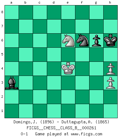 Last move : 0-1 2018 December 25 13:10:3 [Event "FICGS__CHESS__CLASS_B__000261"] [Site "FICGS"] [Date "2017.10.30"] [Round "1"] [White "Domingo,Jordi"] [Black "Duttagupta,Aniruddha"] [Result "0-1"] [WhiteElo "1896"] [BlackElo "1865"] 1.e4 c5 2.Nf3 d6 3.c3 Nf6 4.Be2 g6 5.O-O Bg7 6.Bb5+ Bd7 7.Bxd7+ Nbxd7 8.Qe2 O-O 9.d4 e6 10.e5 Nd5 11.Bg5 Qc7 12.exd6 Qxd6 13.Nbd2 cxd4 14.Nxd4 h6 15.Be3 Rfd8 16.Rad1 Nxe3 17.fxe3 a6 18.Ne4 Qe7 19.Nf3 b5 20.Nd4 Rac8 21.a4 bxa4 22.Qxa6 Ne5 23.Ra1 Ra8 24.Qe2 Qc7 25.Rf4 h5 26.h3 Bh6 27.Rf2 Rdb8 28.Kh1 Qc4 29.Nd6 Qxe2 30.Rxe2 Bf8 31.N6b5 Nc4 32.Nc7 Ra7 33.Ncxe6 a3 34.b3 fxe6 35.Nc6 Rxb3 36.Nxa7 Bg7 37.R1a2 Rb1+ 38.Kh2 h4 39.Nc6 Bxc3 40.g3 Rb2 41.gxh4 Nxe3 42.Kg3 Nd5 43.Kf3 Rxa2 44.Rxa2 Bb2 45.Nd4 Nb4 46.Rxa3 Bxa3 47.Nxe6 Kh7 48.Kg4 Nd5 49.Kf3 Kh6 50.Ke4 Nf6+ 0-1 Sicilian Kingside Castling by player White (move 5) Kingside Castling by player Black (move 8) 10 pieces endgame at move 46 : White KRNPP , Black KBNPP WHITE : King + 1 Rook 1 Knight 2 Pawns BLACK : King + 1 Bishop 1 Knight 2 Pawns 9 pieces endgame at move 46 : White KNPP , Black KBNPP WHITE : King + 1 Knight 2 Pawns BLACK : King + 1 Bishop 1 Knight 2 Pawns 8 pieces endgame at move 47 : White KNPP , Black KBNP WHITE : King + 1 Knight 2 Pawns BLACK : King + 1 Bishop 1 Knight 1 Pawn Player Black won this chess game. Follow this game move after move (download)Mistrust is the most necessary characteristic of the Chess player. (Siegbert Tarrasch) Ich kenne keine einzige Person, die behaupten würde, Garri Kasparow sei ein guter Mensch (Nigel Short) La captura del Rey enemigo es la finalidad pero no el primer objetivo de la partida. (William Steinitz) Tout change constamment, y compris dans le monde des Echecs. (Botvinnik) O divine art of subtlety and secrecy! Through you we learn to be invisible, through you inaudible and hence we can hold the enemy's fate in our hands. (Sun Tzu)
