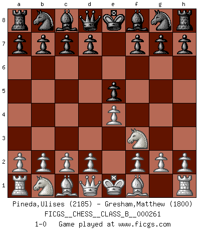 Last move : 1-0 2018 January 7 10:39:33 [Event "FICGS__CHESS__CLASS_B__000261"] [Site "FICGS"] [Date "2017.10.30"] [Round "1"] [White "Pineda,Ulises"] [Black "Gresham,Matthew"] [Result "1-0"] [WhiteElo "2185"] [BlackElo "1800"] 1.e4 e5 2.Nf3 1-0 This chess game has been lost on time (started : 2017.10.30 18:6:26) King's knight Opening Player White won this chess game. Follow this game move after move (download)Bobby is the finest Chess player this country ever produced. His memory for the moves, his brilliance in dreaming up combinations, and his fierce determination to win are uncanny. (John Collins) Schon mancher Spieler hat aufgegeben, um zu vermeiden, daß er eine Figur verliert. (Savielly Grigorievitsch Tartakower) a manera como él juega al Ajedrez, demuestra la completa naturaleza de un hombre. (Stanley Ellin) La conception d'un plan est le processus par lequel un joueur exploite les avantages de sa position tout en s'efforçant d'en réduire au minimum les inconvénients. Afin de garantir le succès, un plan doit toujours se fonder sur un diagnostic objectif des particularités d'une position. La conception d'un plan est d'autant plus difficile que la position est équilibrée, et grandement facilitée lorsqu'il n'existe qu'un seul plan susceptible de répondre aux exigences de la position. (Harry Golombek) Mandala - that's it! 16x16 squares as multiple of the four and the eight because of the Four Noble Truths and the Noble Eightfold Path. (Heinz-Georg Lehnhoff about Big Chess)