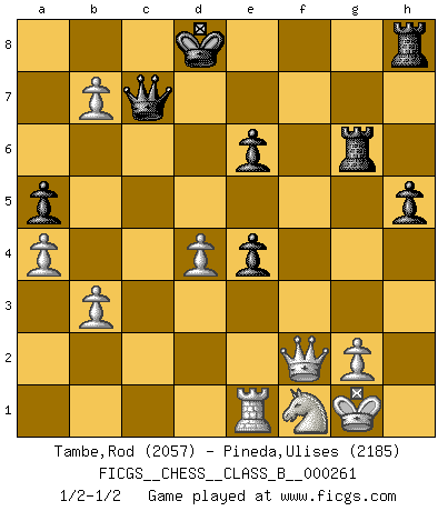 Last move : 1/2-1/2 2018 June 8 7:14:0 [Event "FICGS__CHESS__CLASS_B__000261"] [Site "FICGS"] [Date "2017.10.30"] [Round "1"] [White "Tambe,Rod"] [Black "Pineda,Ulises"] [Result "1/2-1/2"] [WhiteElo "2057"] [BlackElo "2185"] 1.d4 Nf6 2.Bg5 d5 3.e3 c5 4.Nd2 cxd4 5.exd4 Nc6 6.Ngf3 h6 7.Bf4 g5 8.Bg3 Qb6 9.Nb3 Ne4 10.Bd3 Bg7 11.O-O Nxg3 12.hxg3 g4 13.Nh2 h5 14.c3 Kf8 15.a4 a5 16.Bb5 Na7 17.Be2 Nc6 18.Bb5 Na7 19.Be2 Bf5 20.Re1 Rd8 21.Nf1 Bh6 22.Ra3 Qc7 23.Nc1 Bg5 24.Rb3 Bd7 25.Ra3 e6 26.Nd3 Nc8 27.Ne5 Bc6 28.Bd3 Nd6 29.f3 gxf3 30.Qxf3 Ke7 31.b3 Rh6 32.Ra2 Rdh8 33.Rf2 Ke8 34.Qe2 Kd8 35.c4 f5 36.Nh2 Bf6 37.Qe3 Ne4 38.Bxe4 Bxe5 39.cxd5 Bxg3 40.dxc6 fxe4 41.cxb7 Rg6 42.Nf1 Bxf2+ 43.Qxf2 1/2-1/2 Trompowsky attack (Ruth, Opovcensky Opening) Kingside Castling by player White (move 11) This chess game ended in a draw. Follow this game move after move (download)In the perfect Chess combination as in a first-rate short story, the whole plot and counter-plot should lead up to a striking finale, the interest not being allayed until the very last moment. (Yates and Winter) Der Schachmeister von Heute braucht Courage, einen Killerinstinkt, Ausdauer und Arroganz. (Larry Evans) Las ideas audaces son como las piezas del Ajedrez que avanzan hacia adelante. Ellas pueden ser vencidas, pero también pueden iniciar una partida victoriosa. (Goethe) Il a essayé de se convaincre qu'il pourrait empêcher toutes les erreurs et ne jamais perdre. L'horreur ! Gary Kasparov au sujet de Robert Fischer. If we don't succeed, we run the risk of failure. (George W. Bush)