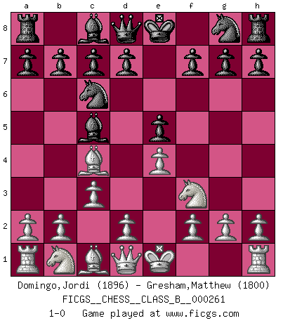 Last move : 1-0 2017 December 10 19:42:54 [Event "FICGS__CHESS__CLASS_B__000261"] [Site "FICGS"] [Date "2017.10.30"] [Round "1"] [White "Domingo,Jordi"] [Black "Gresham,Matthew"] [Result "1-0"] [WhiteElo "1896"] [BlackElo "1800"] 1.e4 e5 2.Nf3 Nc6 3.Bc4 Bc5 4.c3 1-0 This chess game has been lost on time (started : 2017.10.30 18:6:26) Giuoco Piano Player White won this chess game. Follow this game move after move (download)Why must I lose to this idiot ? (Aron Nimzovich) Der Freibauer hat für mich eine Seele, genau wie der Mensch, Wünsche, die unerkannt in ihm schlummern, und Befürchtungen, von deren Existenz er selbst kaum ahnt. (Aaron Nimzowitsch) En el Ajedrez, cuando menos, el valiente hereda la tierra. (Edmar Mednis) Un footballeur joue avec ses pieds, parfois avec sa tête. Un joueur d'échecs ne joue qu'avec sa tête. Et quand il ne joue plus, il meurt. (Jacob Murray) Only sick music makes money today. (Friedrich Nietzsche)