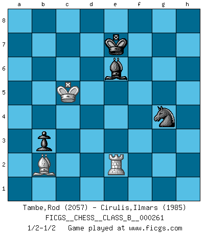 Last move : 1/2-1/2 2018 May 15 21:38:1 [Event "FICGS__CHESS__CLASS_B__000261"] [Site "FICGS"] [Date "2017.10.30"] [Round "1"] [White "Tambe,Rod"] [Black "Cirulis,Ilmars"] [Result "1/2-1/2"] [WhiteElo "2057"] [BlackElo "1985"] 1.d4 e6 2.c4 b6 3.a3 f5 4.Nc3 Bb7 5.Bf4 Nf6 6.e3 Be7 7.Nh3 O-O 8.Rc1 Ne8 9.Bg3 g5 10.f3 d6 11.Bd3 Nd7 12.O-O Bf6 13.Re1 Ng7 14.b4 h5 15.Bb1 a5 16.Nb5 axb4 17.axb4 Ra1 18.Qd2 h4 19.Bf2 Rf7 20.Qb2 Rxb1 21.Rxb1 g4 22.fxg4 fxg4 23.Nf4 Be4 24.Qe2 e5 25.Nd5 exd4 26.Rbd1 g3 27.hxg3 d3 28.Qg4 Bf5 29.Nxf6+ Nxf6 30.Qxh4 Ne6 31.g4 Bxg4 32.Nd4 Nxd4 33.exd4 Rh7 34.Qg3 Kf7 35.Rxd3 Qh8 36.Kf1 Rg7 37.Qf4 Qh1+ 38.Bg1 Be6 39.Rg3 Bxc4+ 40.Kf2 Rxg3 41.Qxg3 Qh6 42.Bh2 Qd2+ 43.Kg1 Qxd4+ 44.Qf2 Qxf2+ 45.Kxf2 Nd5 46.Rb1 b5 47.Rb2 Nc3 48.Kg3 Ne2+ 49.Kh4 Nc1 50.Rb1 Nd3 51.g4 Kg6 52.Bg1 Ba2 53.Ra1 Nxb4 54.Ba7 Be6 55.Bb8 Nd5 56.Ra7 Ne3 57.Bxc7 Nxg4 58.Bxd6 Bc8 59.Kg3 Kf5 60.Rc7 Nf6 61.Kf3 Ke6 62.Bg3 Bd7 63.Rc2 Kd5 64.Rd2+ Kc5 65.Bf2+ Kc6 66.Bh4 Ne8 67.Rc2+ Kd5 68.Be7 Ke6 69.Bf8 Kf7 70.Ba3 Nf6 71.Ke3 b4 72.Bb2 Ke7 73.Kd4 Be6 74.Kc5 b3 75.Re2 Ng4 1/2-1/2 Queen's pawn : Keres defense Kingside Castling by player Black (move 7) Kingside Castling by player White (move 12) 10 pieces endgame at move 53 : White KRBP , Black KBNPPP WHITE : King + 1 Rook 1 Bishop 1 Pawn BLACK : King + 1 Bishop 1 Knight 3 Pawns 9 pieces endgame at move 57 : White KRBP , Black KBNPP WHITE : King + 1 Rook 1 Bishop 1 Pawn BLACK : King + 1 Bishop 1 Knight 2 Pawns 8 pieces endgame at move 57 : White KRB , Black KBNPP WHITE : King + 1 Rook 1 Bishop BLACK : King + 1 Bishop 1 Knight 2 Pawns 7 pieces endgame at move 58 : White KRB , Black KBNP WHITE : King + 1 Rook 1 Bishop BLACK : King + 1 Bishop 1 Knight 1 Pawn This chess game ended in a draw. Follow this game move after move (download)Chess, like love, is infectious at any age. (Flohr) Ja, jede Frau in Holland liebt mich bestimmt, und alle Männer hassen mich. (Loek van Wely) Solo existe una cosa que Fischer hace en el Ajedrez sin placer: ¡perder!. (Boris Spassky) Les échecs sont plus proches de l'art de l'assassinat que de l'art de la guerre. (Arturo Perez-Reverte) Wawaweewa ! (Borat: Cultural learnings of America for make benefit glorious nation of Kazakhstan)