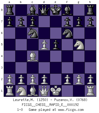 Last move : 1-0 2017 December 5 7:13:34 [Event "FICGS__CHESS__RAPID_E__000192"] [Site "FICGS"] [Date "2017.10.31"] [Round "1"] [White "Leurette,Marc-Antoine"] [Black "Puzanov,Vasyl"] [Result "1-0"] [WhiteElo "1250"] [BlackElo "0768"] 1.e4 e5 2.Nf3 Nc6 3.Bc4 Nf6 4.Ng5 d5 5.exd5 1-0 This chess game has been lost on time (started : 2017.10.31 13:25:15) Two knights defense Player White won this chess game. Follow this game move after move (download)All that matters on the Chessboard is good moves. (Bobby Fischer) Ich tröste mich mit dem Vergnügen, daß Schachfans, Zuschauer und Leser glücklich sind, wenn ein Großmeister etwas riskiert, statt nur Klötzchen zu schieben. (Mikhail Nekhemyevich Tal) a manera como él juega al Ajedrez, demuestra la completa naturaleza de un hombre. (Stanley Ellin) Des combinaisons [dans le jeu d'échecs] pareilles à des mélodies. Je crois entendre pour ainsi dire la musique des coups... (Vladimir Nabokov) Once you start thinking you have nothing left to learn, you have everything to learn. (Steve Badget)