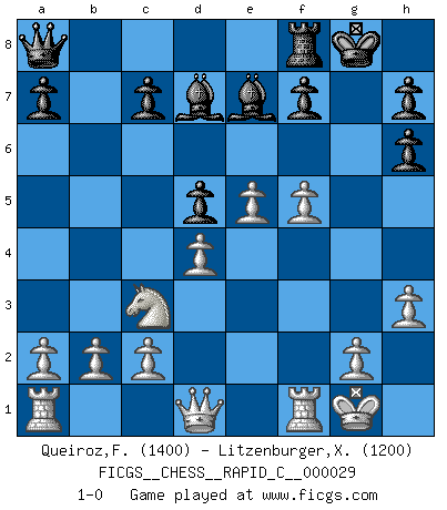 Last move : 1-0 2007 May 12 13:46:22 [Event "FICGS__CHESS__RAPID_C__000029"] [Site "FICGS"] [Date "2007.04.16"] [Round "1"] [White "Queiroz,Florencio"] [Black "Litzenburger,Xavier"] [Result "1-0"] [WhiteElo "1400"] [BlackElo "1200"] 1.e4 e5 2.Nf3 Nc6 3.Bb5 d5 4.Nxe5 Nf6 5.Nxc6 bxc6 6.Bxc6+ Bd7 7.Bxa8 Qxa8 8.e5 Ng4 9.d4 Be7 10.O-O O-O 11.h3 Nh6 12.Bxh6 gxh6 13.Nc3 Bg5 14.f4 Be7 15.f5 1-0 Ruy Lopez (Spanish Opening) Kingside Castling by player White (move 10) Kingside Castling by player Black (move 10) Player White won this chess game. Follow this game move after move (download)A good sacrifice is one that is not necessarily sound but leaves your opponent dazed and confused. (Rudolph Spielmann) Ich habe Putins Aufstieg an die Macht beobachtet und seine Politik, die demokratischen Institutionen meines Landes zu zerstören. (Garry Kasparov) De eso se trata el Ajedrez. Un día le das una lección a tu oponente y al día siguiente el te da una a tí. (Bobby Fischer) Avec des compensations pour le matériel en plus... (Anonyme) Only sick music makes money today. (Friedrich Nietzsche)