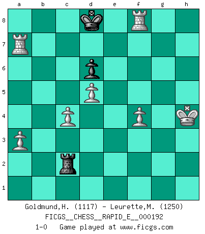 Last move : 1-0 2017 December 7 19:56:49 [Event "FICGS__CHESS__RAPID_E__000192"] [Site "FICGS"] [Date "2017.10.31"] [Round "1"] [White "Goldmund,Heike"] [Black "Leurette,Marc-Antoine"] [Result "1-0"] [WhiteElo "1117"] [BlackElo "1250"] 1.b4 e5 2.Bb2 Bxb4 3.Bxe5 Nc6 4.Bb2 d5 5.e3 Nf6 6.Nf3 Bg4 7.a3 Be7 8.Be2 d4 9.Nxd4 Bxe2 10.Nxe2 Qd7 11.O-O O-O-O 12.d4 h5 13.Nd2 g5 14.c4 g4 15.d5 Ne5 16.Bxe5 Rh6 17.Bf4 Rh7 18.Qc2 h4 19.Rab1 Bd6 20.Bxd6 cxd6 21.Ne4 Nxe4 22.Qxe4 Rg7 23.Nd4 Re8 24.Qf5 Re5 25.Qxd7+ Kxd7 26.Rxb7+ Ke8 27.Rxa7 g3 28.f4 gxh2+ 29.Kxh2 Rxe3 30.Nf5 Reg3 31.Nxg7+ Rxg7 32.Re1+ Kd8 33.R1e7 Rh7 34.Kh3 Rg7 35.Kxh4 Rxg2 36.Rxf7 Rc2 37.Rf8+ 1-0 Polish (Sokolsky) opening Kingside Castling by player White (move 11) Queenside Castling by player Black (move 11) 10 pieces endgame at move 36 : White KRRPPPP , Black KRP WHITE : King + 2 Rooks 4 Pawns BLACK : King + 1 Rook 1 Pawn Player White won this chess game. Follow this game move after move (download)All Chess players should have a hobby. (Savielly Tartakower) Wie bekannt hörte Morphy 1859 auf, Schach zu spielen. Seine Enttäuschung galt nicht so sehr dem Schach, wie den Schachspielern. (Robert James Fischer) Por tratar de evitar la pérdida de una pieza, muchas personas han perdido una partida de Ajedrez. (Savielly Tartakover) On peut tirer plus d'utilité d'une partie perdue que de 100 parties gagnées. (Capablanca) The real danger is not that computers will begin to think like men, but that men will begin to think like computers. (Sydney J. Harris)