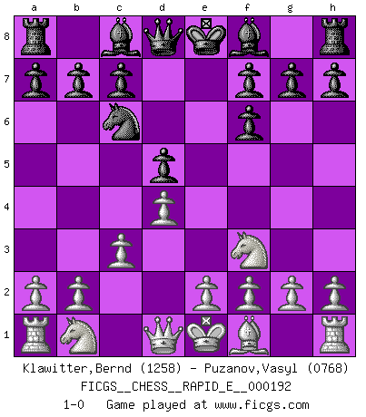 Last move : 1-0 2017 December 5 19:15:46 [Event "FICGS__CHESS__RAPID_E__000192"] [Site "FICGS"] [Date "2017.10.31"] [Round "1"] [White "Klawitter,Bernd"] [Black "Puzanov,Vasyl"] [Result "1-0"] [WhiteElo "1258"] [BlackElo "0768"] 1.d4 Nf6 2.Bg5 d5 3.Nf3 Nc6 4.Bxf6 exf6 5.c3 1-0 This chess game has been lost on time (started : 2017.10.31 13:25:15) Trompowsky attack (Ruth, Opovcensky Opening) Player White won this chess game. Follow this game move after move (download)It was clear to me that the vulnerable point of the American Grandmaster (Bobby Fischer) was in double-edged, hanging, irrational positions, where he often failed to find a win even in a won position. (Efim Geller) Es ist wirklich schade, dass so viele Schachspieler nicht auf ihr Äußeres achten! (Alexandra Kosteniuk) Si un gobernante no entiende al Ajedrez, ¿como puede governar él un reinado?. (El Rey Khusros II) Aux échecs, les retours au sommet sont rares : les dommages psychologiques consécutifs à une défaite sont trop sévères. (Daily Telegraph) See no evil, hear no evil, speak no evil. (The 3 monkeys)