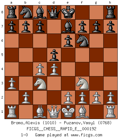 Last move : 1-0 2017 December 5 7:13:34 [Event "FICGS__CHESS__RAPID_E__000192"] [Site "FICGS"] [Date "2017.10.31"] [Round "1"] [White "Bromo,Alexis"] [Black "Puzanov,Vasyl"] [Result "1-0"] [WhiteElo "1010"] [BlackElo "0768"] 1.d4 Nf6 2.c4 e6 3.a3 d5 4.Nc3 Be7 5.Nf3 1-0 This chess game has been lost on time (started : 2017.10.31 13:25:15) Queen's pawn game Player White won this chess game. Follow this game move after move (download)The Chess pieces are the block alphabet which shapes thoughts; and these thoughts, although making a visual design on the chessboard, express their beauty abstractly, like a poem. (Marcel Duchamp) Mein Gehirn das ist mein zweitwichtigstes Organ [Aus dem Film: Der Schläfer]. (Woody Allen) La maestría del Ajedrez consiste esencialmente en analizar posiciónes de Ajedrez con precisión. (Mikhail Botvinnik) Toutes les manuvres exécutées sur une colonne ouverte ont pour but ultime l'intrusion définitive sur la septième ou la huitième rangée, en plein cur de la position ennemie. (Aaron Nimzovitch) You can only get smarter by playing a smarter opponent. (Revolver, movie)