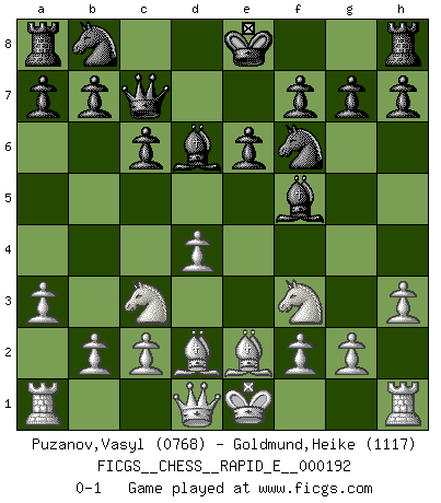 Last move : 0-1 2017 December 17 18:59:21 [Event "FICGS__CHESS__RAPID_E__000192"] [Site "FICGS"] [Date "2017.10.31"] [Round "1"] [White "Puzanov,Vasyl"] [Black "Goldmund,Heike"] [Result "0-1"] [WhiteElo "0768"] [BlackElo "1117"] 1.e4 d5 2.exd5 Qxd5 3.Nc3 Qa5 4.d4 Nf6 5.Bd2 c6 6.Nf3 Bf5 7.a3 e6 8.Be2 Qc7 9.h3 Bd6 0-1 Scandinavian (centre counter) defense Player Black won this chess game. Follow this game move after move (download)Bobby is the most misunderstood, misquoted celebrity walking the face of this earth. (Yasser Seirawan) Zeige mir drei Eröffnungsvarianten und ich beweise dir, dass zwei davon inkorrekt sind. (Emanuel Lasker) El Ajedrez es el gimnasio de la mente. (Blaise Pascal) Il n'y a pas de prix trop élevé au scalp de l'ennemi. (Koblentz) To send light into the darkness of men's hearts - such is the duty of the artist. (Schumann)