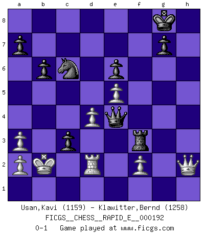 Last move : 0-1 2017 November 20 17:13:2 [Event "FICGS__CHESS__RAPID_E__000192"] [Site "FICGS"] [Date "2017.10.31"] [Round "1"] [White "Usan,Kavi"] [Black "Klawitter,Bernd"] [Result "0-1"] [WhiteElo "1159"] [BlackElo "1258"] 1.e4 c6 2.d4 d5 3.e5 Bf5 4.Na3 e6 5.Bd3 Bb4+ 6.c3 Bxa3 7.bxa3 Ne7 8.Bxf5 Nxf5 9.Nf3 O-O 10.Rb1 b6 11.g4 Ne7 12.h4 Nd7 13.h5 c5 14.Ng5 h6 15.Nf3 f6 16.Bf4 fxe5 17.Bxe5 Rxf3 18.Qxf3 Nxe5 19.dxe5 Qd7 20.Rd1 Rf8 21.Qg2 Nc6 22.g5 hxg5 23.Qxg5 Qf7 24.Rd2 Qf3 25.h6 Qxh1+ 26.Ke2 Qf3+ 27.Ke1 Qh1+ 28.Ke2 Qxh6 29.Qg3 c4 30.Kd1 Qh1+ 31.Kc2 Qe4+ 32.Kb2 Rf3 33.Qh2 d4 34.cxd4 c3+ 0-1 Caro-Kann : Advance variation Kingside Castling by player Black (move 9) Player Black won this chess game. Follow this game move after move (download)My God, Bobby Fischer plays so simply. (Alexei Suetin) Offensichtlich kennt Kasparow nichts anderes als Schach, und ich könnte 500 weitere Spieler dieser Sorte benennen. (Judith Polgar) Un Peón pasado es un criminal, quién debe ser mantenido bajo candado y llave. Leves medidas, tales como vigilancia policiaca, no son suficientes. (Aaron Nimzovich) Donnez-moi un Cavalier en 6e et je gagnerais toutes mes parties. (Steinitz) Nobody is always a winner, and anybody who says he is, is either a liar or doesn't play poker. (Amarillo Slim)