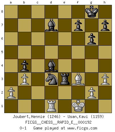 Last move : 0-1 2017 December 7 8:6:32 [Event "FICGS__CHESS__RAPID_E__000192"] [Site "FICGS"] [Date "2017.10.31"] [Round "1"] [White "Joubert,Hennie"] [Black "Usan,Kavi"] [Result "0-1"] [WhiteElo "1246"] [BlackElo "1159"] 1.e4 c5 2.Nf3 d6 3.d4 cxd4 4.Nxd4 Nf6 5.Nc3 g6 6.f4 e5 7.Ndb5 a6 8.Na3 Bg7 9.Be2 O-O 10.O-O exf4 11.Bxf4 Be6 12.Bxd6 Re8 13.Bxb8 Qxb8 14.h3 Qg3 15.Rf3 Qg5 16.Qe1 Bd7 17.Rg3 Qc5+ 18.Qf2 Qc6 19.Bf3 Bf8 20.Kh1 b5 21.e5 Bc5 22.Bxc6 Bxf2 23.Bxa8 Bxg3 24.Bb7 Bxe5 25.Ne4 Nxe4 26.c3 Nc5 27.Bf3 Bg3 28.Nc2 a5 29.Nd4 b4 30.cxb4 axb4 31.Kg1 Nd3 32.b3 Be5 33.Rd1 Bxd4+ 34.Kf1 Re3 0-1 Sicilian : Dragon, Levenfish variation Kingside Castling by player Black (move 9) Kingside Castling by player White (move 10) Player Black won this chess game. Follow this game move after move (download)In Chess, just as in life, today's bliss may be tomorrow's poison. (Assaic) Es gibt keine einzige Frau, der ich nicht einen Springer vorgeben könnte und trotzdem gewänne. (Robert James Fischer) Cuando le juegas a Fischer, no es una cuestion de si vas a ganar o perder. Es una cuestion de si vas a sobrevivir. (Boris Spassky) Même un GMI sait rarement calculer sur plus de cinq coups une attaque à sacrifices. (Rudolf Spielmann) The only thing that overcomes hard luck is hard work. (Harry Golden)