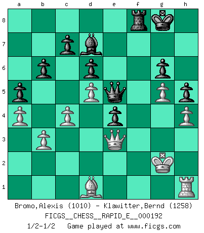 Last move : 1/2-1/2 2017 November 18 16:53:34 [Event "FICGS__CHESS__RAPID_E__000192"] [Site "FICGS"] [Date "2017.10.31"] [Round "1"] [White "Bromo,Alexis"] [Black "Klawitter,Bernd"] [Result "1/2-1/2"] [WhiteElo "1010"] [BlackElo "1258"] 1.d4 Nf6 2.c4 e6 3.a3 b6 4.Nc3 Bb7 5.f3 Be7 6.Bf4 d6 7.e3 O-O 8.Bd3 Nbd7 9.Nge2 a6 10.O-O Nh5 11.Qc2 h6 12.Ng3 Nxf4 13.exf4 Nf6 14.f5 e5 15.d5 Re8 16.Rae1 Bf8 17.Nce4 Bc8 18.Nxf6+ Qxf6 19.Nh5 Qg5 20.Ng3 Bd7 21.b3 h5 22.Nh1 Be7 23.Nf2 f6 24.Ne4 Qxf5 25.h3 Qf4 26.g3 Qh6 27.Kg2 f5 28.Nf2 Rf8 29.h4 g6 30.Nh3 Rf7 31.f4 e4 32.Be2 a5 33.Ng5 Bxg5 34.fxg5 Qh8 35.a4 Qe5 36.Rd1 f4 37.gxf4 Rxf4 38.Rxf4 Qxf4 39.Rh1 Rf8 40.Bd1 Bf5 41.Qf2 Qe5 42.Qe3 Bd7 1/2-1/2 Queen's pawn game Kingside Castling by player Black (move 7) Kingside Castling by player White (move 10) This chess game ended in a draw. Follow this game move after move (download)A great player and a great example for many. His book My 60 Memorable Games had a big impact on me. It is a shame he didn't continue to enrich the world of chess with his unparalleled understanding after 1972. (Jan Timman, about Bobby Fischer's death) Nach Morphy wurde nichts neues mehr in der Behandlung offener Positionen gefunden. (Mikhail Moiseyevich Botvinik) Debes de llevar a tu oponente hacia un profundo y obscuro bosque donde 2+2=5, y el camino que conduce a la salida es suficientemente ancho para solamente uno. (Mikhail Tal) A chaque perte on perd un peu de soi. (Joël Lautier) If you have any trouble condescending, find a Unix user to show you how it's done. (Scott Adams)