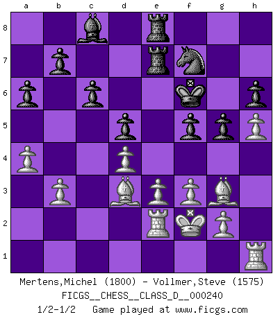 Last move : 1/2-1/2 2017 December 12 9:56:28 [Event "FICGS__CHESS__CLASS_D__000240"] [Site "FICGS"] [Date "2017.10.31"] [Round "1"] [White "Mertens,Michel"] [Black "Vollmer,Steve"] [Result "1/2-1/2"] [WhiteElo "1800"] [BlackElo "1575"] 1.d4 d5 2.c4 e6 3.Nc3 Nf6 4.Nf3 Bb4 5.Bg5 O-O 6.e3 a6 7.cxd5 exd5 8.Qb3 Nc6 9.Bd3 Be6 10.O-O Bxc3 11.Qxc3 h6 12.Bf4 Ne4 13.Qc2 f5 14.Ne5 Nxe5 15.Bxe5 c6 16.f3 Nd6 17.Rfe1 Qd7 18.b3 Rad8 19.Qc5 Nf7 20.Bg3 g5 21.h4 Kg7 22.Qb4 Rde8 23.Kf2 Qe7 24.Qxe7 Rxe7 25.a4 Rfe8 26.Re2 Kg6 27.Rh1 Bc8 28.h5+ Kf6 1/2-1/2 QGD : Ragozin variation Kingside Castling by player Black (move 5) Kingside Castling by player White (move 10) This chess game ended in a draw. Follow this game move after move (download)What is the difference between chess and football? Everybody understands football, but nobody plays it. Everybody plays chess, but nobody understands it. Everything is relative. (Vladimir Kramnik) Der Freibauer hat für mich eine Seele, genau wie der Mensch, Wünsche, die unerkannt in ihm schlummern, und Befürchtungen, von deren Existenz er selbst kaum ahnt. (Aaron Nimzowitsch) El Ajedrez es parte de la cultura, y si una cultura esta en decadencia, entonces también el Ajedrez declinará. (Mikhail Botvinnik) Roi des jeux et jeu des rois, les échecs portent en eux un sentiment d'infini. Ils donnent à celui qui s'est efforcé d'en approfondir les arcanes l'impression de n'être pas à la mesure de l'homme; en fait, ils constituent un résumé de l'univers, un microcosme, et figurent cette grande échelle qui, dans les plans de la lumière descend jusqu'à la matière, qui des abîmes insondables remonte jusqu'en l'infini de Dieu. (Pyrame) If you work for a living, why do you kill yourself working ? (Tuco to a chicken in The Good, The Bad and The Ugly)