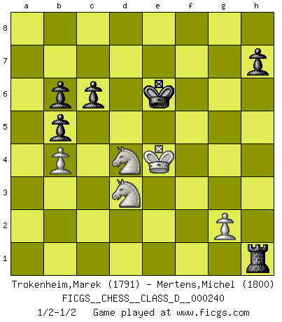 Last move : 1/2-1/2 2018 January 4 12:27:21 [Event "FICGS__CHESS__CLASS_D__000240"] [Site "FICGS"] [Date "2017.10.31"] [Round "1"] [White "Trokenheim,Marek"] [Black "Mertens,Michel"] [Result "1/2-1/2"] [WhiteElo "1791"] [BlackElo "1800"] 1.b4 e5 2.Bb2 f6 3.e4 Bxb4 4.Bc4 Nc6 5.f4 d6 6.f5 g6 7.c3 Bc5 8.d4 Bb6 9.Be6 Nge7 10.Bb3 exd4 11.cxd4 d5 12.Nc3 dxe4 13.fxg6 Nxg6 14.Nxe4 Nxd4 15.Ne2 Qe7 16.Bd5 Bg4 17.Bxd4 O-O-O 18.Qb3 Rhf8 19.Rf1 f5 20.Bxb6 axb6 21.N4c3 Rfe8 22.Rf2 Qe5 23.h3 Nf4 24.hxg4 Nxd5 25.Rc1 Nf4 26.Kf1 Nd3 27.Rxf5 Nxc1 28.Rxe5 Nxb3 29.Rxe8 Rxe8 30.axb3 Rg8 31.Kf2 Rxg4 32.Nd5 Rh4 33.Kf3 b5 34.Nef4 c6 35.Ne3 Kd7 36.b4 Rh1 37.Nd3 Kd6 38.Ke4 b6 39.Nf5+ Ke6 40.Nd4+ 1/2-1/2 Polish (Sokolsky) opening Queenside Castling by player Black (move 17) This chess game ended in a draw. Follow this game move after move (download)A man that will take back a move at Chess will pick a pocket. (Richard Fenton) Ich liebe den Moment, wenn ich das Ego meines Gegenüber breche. (Robert James Fischer) Un Peón pasado es un criminal, quién debe ser mantenido bajo candado y llave. Leves medidas, tales como vigilancia policiaca, no son suficientes. (Aaron Nimzovich) Il s'avisa de me proposer d'apprendre les échecs qu'il jouait un peu... me voilà forcené des échecs. J'achète un échiquier, je m'enferme dans ma chambre, j'y passe des jours et des nuits à vouloir apprendre par cur toutes les parties. (Jean-Jacques Rousseau, Confessions) Be who you are, and say what you feel because those who mind don't matter, and those who matter don't mind. (Dr Seuss)