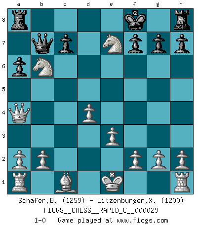 Last move : 1-0 2007 May 16 12:9:11 [Event "FICGS__CHESS__RAPID_C__000029"] [Site "FICGS"] [Date "2007.04.16"] [Round "1"] [White "Schafer,Banner"] [Black "Litzenburger,Xavier"] [Result "1-0"] [WhiteElo "1259"] [BlackElo "1200"] 1.d4 d5 2.c4 e6 3.e3 Nf6 4.Nf3 Nc6 5.c5 e5 6.Bb5 a6 7.Bxc6+ bxc6 8.Nxe5 Be7 9.Nxc6 Qd7 10.Ne5 Qb5 11.Nc3 Qb7 12.Qa4+ Bd7 13.c6 Bxc6 14.Nxc6 Nd7 15.Nxd5 Kf8 16.Ncxe7 Nb6 17.Nxb6 1-0 Queen's gambit declined Player White won this chess game. Follow this game move after move (download)The passion for playing Chess is one of the most unaccountable in the world. (H.G. Wells) Ja, jede Frau in Holland liebt mich bestimmt, und alle Männer hassen mich. (Loek van Wely) Después de una mala apertura, hay una esperanza en el juego medio. Pero una vez que estas en finales, el momento de la verdad ha llegado. (Edmar Mednis) Les erreurs sont comme les malheurs, elles n'arrivent jamais seules. (Siegbert Tarrasch) After growing wildly for years, the field of computing appears to be reaching its infancy. (John Pierce)