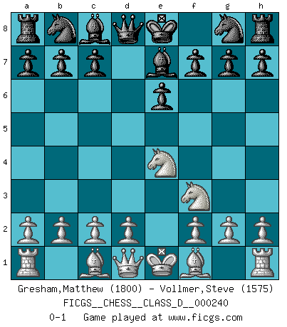 Last move : 0-1 2017 December 11 7:45:2 [Event "FICGS__CHESS__CLASS_D__000240"] [Site "FICGS"] [Date "2017.10.31"] [Round "1"] [White "Gresham,Matthew"] [Black "Vollmer,Steve"] [Result "0-1"] [WhiteElo "1800"] [BlackElo "1575"] 1.e4 e6 2.Nc3 d5 3.Nf3 dxe4 4.Nxe4 Be7 0-1 This chess game has been lost on time (started : 2017.10.31 21:37:36) French : Two knights variation Player Black won this chess game. Follow this game move after move (download)Do you realize Fischer almost never has any bad pieces? He exchanges them, and the bad pieces remain with his opponents. (Yuri Balashov) Wenn Spassky eine Figur opfert kannst du genauso gut aufgeben. Aber wenn Tal eine Figur opfert, spiel weiter. Er könnte noch eine weitere opfern, und dann ... wer weiß? (Miguel Najdorf) Bendita sea la memoria de aquel que dio al mundo este juego inmortal. (A. G. Gardiner) Toutes choses étant égales, c'est la conviction qui gagne. Alliée à une volonté de vaincre, elle sert de détonateur, suscite des idées, disperse les doutes et aide à penser clairement. (Robert Fischer) Are you threatening me, Master Jedi ? (Chancellor Palpatine in Star Wars ep.3)