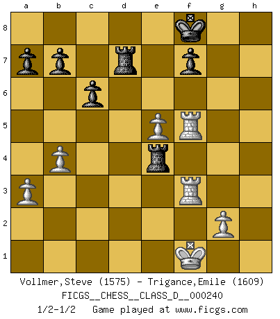 Last move : 1/2-1/2 2017 November 17 14:26:20 [Event "FICGS__CHESS__CLASS_D__000240"] [Site "FICGS"] [Date "2017.10.31"] [Round "1"] [White "Vollmer,Steve"] [Black "Trigance,Emile"] [Result "1/2-1/2"] [WhiteElo "1575"] [BlackElo "1609"] 1.d4 d5 2.c4 dxc4 3.e3 e5 4.Bxc4 exd4 5.Qxd4 Bb4+ 6.Bd2 Qxd4 7.exd4 Nc6 8.Ne2 Nf6 9.O-O Bxd2 10.Nxd2 O-O 11.Rac1 Be6 12.Nf3 Bxc4 13.Rxc4 Rad8 14.Ne5 Nxe5 15.dxe5 Nd5 16.a3 c6 17.Nc3 Nxc3 18.Rxc3 Rd2 19.b4 Rfd8 20.f4 Re2 21.h4 R8d2 22.Rg3 Kf8 23.h5 g6 24.hxg6 hxg6 25.f5 gxf5 26.Rxf5 Rd7 27.Kf1 Re4 28.Rgf3 1/2-1/2 Queen's gambit accepted Kingside Castling by player White (move 9) Kingside Castling by player Black (move 10) This chess game ended in a draw. Follow this game move after move (download)There are tough players and nice guys, and I'm a tough player. (Bobby Fischer) Das typische an einem Großmeister ist, daß er eine gewonnene Position schnell und schmerzlos gewinnt. (Irving Chernev) Aquellos que dicen entender al Ajedrez, no entienden nada. (Robert Hubner) A chaque perte on perd un peu de soi. (Joël Lautier) If you have any trouble condescending, find a Unix user to show you how it's done. (Scott Adams)