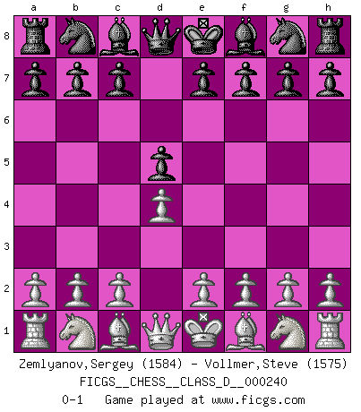 Last move : 0-1 2017 December 11 7:45:2 [Event "FICGS__CHESS__CLASS_D__000240"] [Site "FICGS"] [Date "2017.10.31"] [Round "1"] [White "Zemlyanov,Sergey"] [Black "Vollmer,Steve"] [Result "0-1"] [WhiteElo "1584"] [BlackElo "1575"] 1.d4 d5 0-1 This chess game has been lost on time (started : 2017.10.31 21:37:36) Queen's pawn game Player Black won this chess game. Follow this game move after move (download)Man is a frivolous, a specious creature, and like a Chess player, cares more for the process of attaining his goal than for the goal itself. (Dostoyevsky) Es ist wirklich schade, dass so viele Schachspieler nicht auf ihr Äußeres achten! (Alexandra Kosteniuk) ¿Quién es tu oponente esta tarde? Esta tarde mi oponente son las piezas negras. (Akiba Rubinstein) On a dit que l'homme se distingue de l'animal par le fait qu'il achète plus de livres qu'il ne peut en lire. Je voudrais suggérer qu'inclure à la liste des livres quelques livres d'échecs rendrait la distinction manifeste. (Edward Lasker) I would love to change the world, but they won't give me the source code. (Unknown)