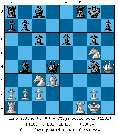 Last move : 0-1 2007 July 25 18:37:24 [Event "FICGS__CHESS__CLASS_F__000034"] [Site "FICGS"] [Date "2007.04.16"] [Round "1"] [White "Lorena,June"] [Black "Stoyanov,Zdravko"] [Result "0-1"] [WhiteElo "1400"] [BlackElo "1288"] 1.d4 d5 2.e4 c6 3.Nc3 e6 4.Be3 Bb4 5.Qd2 dxe4 6.f3 exf3 7.Nxf3 Nf6 8.Bd3 Ng4 9.O-O O-O 10.Bf4 Nd7 11.Bg5 f6 12.h3 fxg5 13.hxg4 Nf6 14.Nxg5 g6 15.Qf2 Nxg4 16.Qh4 Qxd4+ 0-1 This chess game has been lost on time (started : 2007.04.16 19:53:40) Blackmar gambit Kingside Castling by player White (move 9) Kingside Castling by player Black (move 9) Player Black won this chess game. Follow this game move after move (download)I'm not a materialistic person, in that, I don't suffer the lack or loss of money. The absence of worldly goods I don't look back on. For Chess is a way I can be as materialistic as I want without having to sell my soul. (Jamie Walter Adams) Kein Großmeister ist normal. Sie unterscheiden sich nur im Ausmaß Ihrer Verrücktheit. (Viktor Kortschnoi) No volvere nunca a jugar contigo. Has insultado a mi amigo. - cuando un oponente se maldijo por una mala jugada (Miguel Najdorf) Aux échecs, les retours au sommet sont rares : les dommages psychologiques consécutifs à une défaite sont trop sévères. (Daily Telegraph) It is not enough to be a good player... you must also play well. (Siegbert Tarrasch)