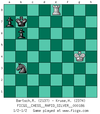 Last move : 1/2-1/2 2018 January 17 8:23:26 [Event "FICGS__CHESS__RAPID_SILVER__000186"] [Site "FICGS"] [Date "2017.11.07"] [Round "2"] [White "Bartsch,Reinhard Andrea"] [Black "Kruse,Herbert"] [Result "1/2-1/2"] [WhiteElo "2137"] [BlackElo "2374"] 1.c4 e5 2.g3 Nf6 3.Bg2 Bc5 4.Nc3 c6 5.Nf3 e4 6.Nh4 d5 7.cxd5 cxd5 8.d3 Ng4 9.O-O g5 10.d4 Be7 11.h3 gxh4 12.hxg4 Nc6 13.f3 exf3 14.Bxf3 Be6 15.Bf4 Qd7 16.Qd3 hxg3 17.e4 dxe4 18.Bxe4 Qxd4+ 19.Qxd4 Nxd4 20.Be5 O-O-O 21.Bxh8 Rxh8 22.Kg2 Bd6 23.Rac1 Kb8 24.Bd5 h5 25.Bxe6 hxg4 26.Rh1 Rxh1 27.Rxh1 fxe6 28.Ne4 Be5 29.b3 Ne2 30.Rh7 b6 31.Rd7 Nc1 32.Rd2 Bf4 33.Rb2 Nd3 34.Rb1 Nb4 35.a3 Nc2 36.Nxg3 Nxa3 37.Re1 Nc2 38.Rxe6 Bxg3 39.Kxg3 Nd4 40.Re8+ Kb7 41.Kxg4 Nxb3 1/2-1/2 English Opening Kingside Castling by player White (move 9) Queenside Castling by player Black (move 20) 10 pieces endgame at move 38 : White KRNP , Black KBNPPP WHITE : King + 1 Rook 1 Knight 1 Pawn BLACK : King + 1 Bishop 1 Knight 3 Pawns 9 pieces endgame at move 38 : White KRP , Black KBNPPP WHITE : King + 1 Rook 1 Pawn BLACK : King + 1 Bishop 1 Knight 3 Pawns 8 pieces endgame at move 39 : White KRP , Black KNPPP WHITE : King + 1 Rook 1 Pawn BLACK : King + 1 Knight 3 Pawns 7 pieces endgame at move 41 : White KRP , Black KNPP WHITE : King + 1 Rook 1 Pawn BLACK : King + 1 Knight 2 Pawns 6 pieces endgame at move 41 : White KR , Black KNPP WHITE : King + 1 Rook BLACK : King + 1 Knight 2 Pawns This chess game ended in a draw. Follow this game move after move (download)One doesn't have to play well, it's enough to play better than your opponent. (Siegbert Tarrasch) Ein Gewinn durch eine ungenaue Kombination, sei sie auch noch so vorzeigbar, erfüllt mich mit Schaudern. (Wilhelm Steinitz) Observen a Garry Kasparov. Después de una derrota, invariablemente el gana la próxima partida. Prácticamente hace pedazos a su siguiente oponente. Eso es algo que tenemos que aprender a lograr. (Maurice Ashley) Celui qui prend des risques peut perdre, celui qui n'en prend pas perd toujours. (Xavier Tartacover) However beautiful the strategy, you should occasionally look at the results. (Winston Churchill)