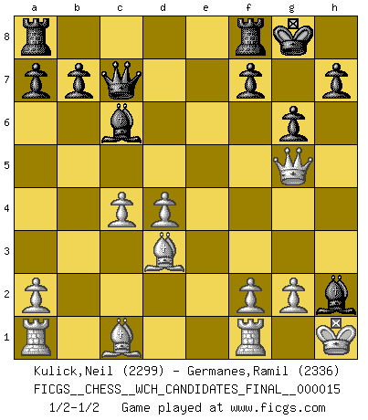 Last move : 1/2-1/2 2017 December 31 0:19:24 [Event "FICGS__CHESS__WCH_CANDIDATES_FINAL__000015"] [Site "FICGS"] [Date "2017.11.08"] [Round "6"] [White "Kulick,Neil"] [Black "Germanes,Ramil"] [Result "1/2-1/2"] [WhiteElo "2299"] [BlackElo "2336"] 1.e4 e5 2.Nf3 Nf6 3.d4 Nxe4 4.Bd3 d5 5.Nxe5 Nd7 6.Nxd7 Bxd7 7.O-O Bd6 8.c4 c6 9.cxd5 cxd5 10.Nc3 Nxc3 11.bxc3 O-O 12.Qh5 g6 13.Qxd5 Qc7 14.c4 Bc6 15.Qg5 Bxh2+ 16.Kh1 1/2-1/2 Petrov : Modern attack, Symmetrical variation Kingside Castling by player White (move 7) Kingside Castling by player Black (move 11) This chess game ended in a draw. Follow this game move after move (download)You sit at the board and suddenly your heart leaps. Your hand trembles to pick up the piece and move it. But what Chess teaches you is that you must sit there calmly and think about whether it's really a good idea and whether there are other better ideas. (Stanley Kubrick) Alle Schachspieler sollten auch ein Hobby haben. (Savielly Grigorievitsch Tartakower) Solo el jugador con la iniciativa tiene el derecho a atacar. (Wilhelm Steinitz) Les Echecs, c'est l'art de la guerre sans les charniers, c'est la résurrection des morts tombés au champ d'honneur, l'espoir perpétuel, la suprématie de l'intelligence sur la force, la culture de l'esprit. (F. Szpiner) You can't play chess if you're groggy from pills. (Anatoly Karpov)