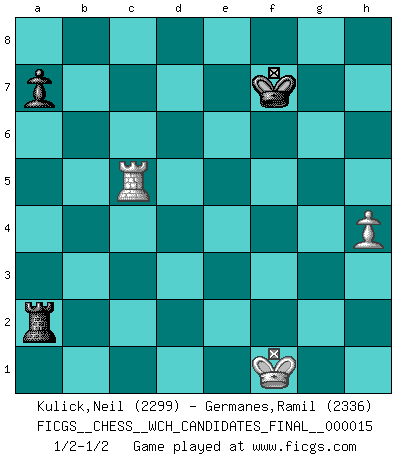 Last move : 1/2-1/2 2018 March 7 23:35:6 [Event "FICGS__CHESS__WCH_CANDIDATES_FINAL__000015"] [Site "FICGS"] [Date "2017.11.08"] [Round "8"] [White "Kulick,Neil"] [Black "Germanes,Ramil"] [Result "1/2-1/2"] [WhiteElo "2299"] [BlackElo "2336"] 1.d4 Nf6 2.c4 e6 3.Nc3 Bb4 4.f3 d5 5.a3 Bxc3+ 6.bxc3 c5 7.cxd5 exd5 8.e3 O-O 9.Bd3 b6 10.Ne2 Ba6 11.O-O Re8 12.Ng3 Bxd3 13.Qxd3 Nc6 14.Bb2 h5 15.Rae1 h4 16.Nf5 h3 17.Ng3 hxg2 18.Kxg2 Ne7 19.e4 Ng6 20.Bc1 cxd4 21.cxd4 dxe4 22.fxe4 Qd7 23.Kg1 Rad8 24.Nf5 Ne7 25.Nxe7+ Qxe7 26.e5 Qe6 27.Rf4 Nd5 28.Rh4 Qg6+ 29.Qxg6 fxg6 30.Rg4 Nf6 31.Rxg6 Rxd4 32.Bb2 Re4 33.Rxe4 Nxe4 34.e6 Re7 35.Rg4 Nc5 36.Bf6 Rxe6 37.Bxg7 Re1+ 38.Kg2 Re2+ 39.Kf1 Ra2 40.Bd4+ Kf7 41.Bxc5 bxc5 42.Rc4 Rxa3 43.Rxc5 Ra2 44.h4 1/2-1/2 Nimzo-Indian : Kmoch variation Kingside Castling by player Black (move 8) Kingside Castling by player White (move 11) 10 pieces endgame at move 37 : White KRBPP , Black KRNPP WHITE : King + 1 Rook 1 Bishop 2 Pawns BLACK : King + 1 Rook 1 Knight 2 Pawns 9 pieces endgame at move 41 : White KRBPP , Black KRPP WHITE : King + 1 Rook 1 Bishop 2 Pawns BLACK : King + 1 Rook 2 Pawns 8 pieces endgame at move 41 : White KRPP , Black KRPP WHITE : King + 1 Rook 2 Pawns BLACK : King + 1 Rook 2 Pawns 7 pieces endgame at move 42 : White KRP , Black KRPP WHITE : King + 1 Rook 1 Pawn BLACK : King + 1 Rook 2 Pawns 6 pieces endgame at move 43 : White KRP , Black KRP WHITE : King + 1 Rook 1 Pawn BLACK : King + 1 Rook 1 Pawn This chess game ended in a draw. Follow this game move after move (download)In order to improve your game, you must study the endgame before everything else, for whereas the endings can be studied and mastered by themselves, the middle game and the opening must be studied in relation to the endgame. (Jose Raul Capablanca) Über Frauen: Chess is better. (Robert James Fischer) El muchacho (en ese entonces un niño de 12 años llamado Anatoly Karpov) no tiene ni idea de lo que es el Ajedrez y no hay futuro en absoluto para el en esta profesión. (Mikhail Botvinnik) Mais l'homme est une créature légère et illogique : semblable au joueur d'échecs, il n'aime que le processus du but à atteindre, non le but lui-même. (Dostoïevsky) Any activity becomes creative when the doer cares about doing it right or doing it better. (John Updike)