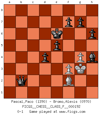 Last move : 0-1 2017 November 23 1:43:34 [Event "FICGS__CHESS__CLASS_F__000192"] [Site "FICGS"] [Date "2017.11.12"] [Round "1"] [White "Pascal,Paco"] [Black "Bromo,Alexis"] [Result "0-1"] [WhiteElo "1390"] [BlackElo "0970"] 1.e4 e5 2.Nf3 Nc6 3.d4 d6 4.d5 Nce7 5.Nc3 h6 6.Qe2 a6 7.b4 b5 8.a4 Bb7 9.a5 Nf6 10.Nxb5 axb5 11.Qxb5+ Nd7 12.Qxb7 Rb8 13.a6 Rxb7 14.axb7 Nb8 15.Bb5+ c6 16.dxc6 Qc7 17.Ra8 Nexc6 18.Be3 Qxb7 19.Ra5 Nd7 20.O-O Nxa5 21.Bxd7+ Kxd7 22.bxa5 Qxe4 23.a6 Qxc2 24.a7 Be7 25.Nd2 Ra8 26.Rb1 Rxa7 27.Bxa7 Qxd2 28.Rb7+ Ke6 29.g3 Qd1+ 30.Kg2 Qd5+ 31.f3 Qxb7 32.Bf2 d5 33.g4 Qb2 34.Kg3 d4 35.h4 Bxh4+ 0-1 Scotch Opening Kingside Castling by player White (move 20) Player Black won this chess game. Follow this game move after move (download)The battle for the ultimate truth will never be won. And that's why Chess is so fascinating. (Hans Kmoch) Um dein Spiel zu verbessern musst du zuallererst das Endspiel studieren, denn diese kann unabhängig studiert werden. Die Eröffnung und das Mittelspiel müssen immer in Bezug gesetzt werden zum Endspiel. (José Raúl Capablanca) Yo no le temo a Spassky. Todos saben que yo soy el mejor. Uno no necesita un torneo para probarlo. (Bobby Fischer) Si rien de grave n'est détecté lors de l'analyse d'une position, on joue alors le coup. Seconde règle de Blumenfeld. Wipe them out. All of them. (Darth Sidious in Star Wars ep.1)