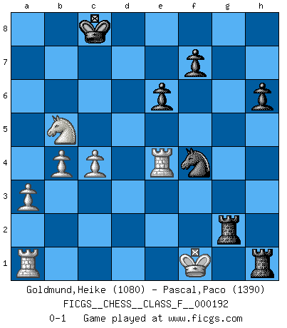 Last move : 0-1 2017 December 12 16:58:3 [Event "FICGS__CHESS__CLASS_F__000192"] [Site "FICGS"] [Date "2017.11.12"] [Round "1"] [White "Goldmund,Heike"] [Black "Pascal,Paco"] [Result "0-1"] [WhiteElo "1080"] [BlackElo "1390"] 1.e4 d5 2.exd5 c6 3.dxc6 bxc6 4.d4 Ba6 5.Bxa6 Nxa6 6.Nf3 h6 7.O-O Nf6 8.Qd3 Nb4 9.Qc4 e6 10.a3 Qd5 11.Qxd5 Nbxd5 12.Ne5 c5 13.dxc5 Bxc5 14.b4 Bd4 15.c3 Bxe5 16.Bb2 Ne4 17.Re1 Bxh2+ 18.Kxh2 Nxf2 19.c4 Nd3 20.Bxg7 Rg8 21.Bd4 N5f4 22.Re4 Rxg2+ 23.Kh1 O-O-O 24.Bxa7 Nf2+ 25.Bxf2 Rxf2 26.Nc3 Rd3 27.Nb5 Rh3+ 28.Kg1 Rg2+ 29.Kf1 Rh1+ 0-1 Scandinavian (centre counter) defense Kingside Castling by player White (move 7) Queenside Castling by player Black (move 23) Player Black won this chess game. Follow this game move after move (download)I guess a certain amount of temperament is expected of Chess geniuses. (Ron Gross) Wie gewinnt Tal? Er entwickelt alle seine Figuren in die Brettmitte und opfert sie dann irgendwo. (Robert James Fischer) No es suficiente ser un buen jugador, se debe también de jugar bién. (Siegbert Tarrasch) Le jeu d'échecs fait naître et fortifie en nous plusieurs qualités précieuses dans le cours de l'existence, telles que la prévoyance, la circonspection, la prudence, et la persévérance. (Benjamin Franklin - 1783, la morale des échecs) Perhaps the current trend of many chess professionals taking up the more lucrative pastime of poker is not a wholly negative one. It may not be too late for humans to relearn how to take risks in order to innovate and thereby maintain the advanced lifestyles we enjoy. And if it takes a poker-playing supercomputer to remind us that we can't enjoy the rewards without taking the risks, so be it. (The Chess Master and the Computer, by Garry Kasparov - 2010)