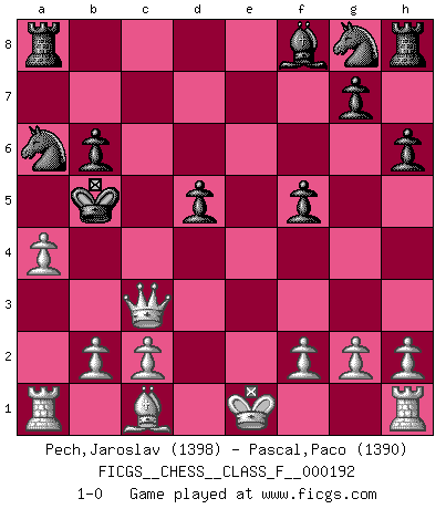 Last move : 1-0 2017 December 24 19:46:27 [Event "FICGS__CHESS__CLASS_F__000192"] [Site "FICGS"] [Date "2017.11.12"] [Round "1"] [White "Pech,Jaroslav"] [Black "Pascal,Paco"] [Result "1-0"] [WhiteElo "1398"] [BlackElo "1390"] 1.e4 d5 2.exd5 c6 3.dxc6 bxc6 4.Nf3 Ba6 5.Bxa6 Nxa6 6.d4 h6 7.Ne5 e6 8.Qf3 f5 9.Qh5+ Ke7 10.Qf7+ Kd6 11.Nc4+ Kd5 12.Nb6+ axb6 13.Nc3+ Kxd4 14.Qxe6 Qd5 15.Nxd5 cxd5 16.Qe3+ Kc4 17.Qc3+ Kb5 18.a4+ 1-0 Scandinavian (centre counter) defense Player White won this chess game. Follow this game move after move (download)The hardest game to win is a won game. (Emanuel Lasker) Ja, ich habe einmal eine Blitzpartie gespielt, es war in einem Zug, 1929. --im Interview 1989 (Mikhail Moiseyevich Botvinik) La estratégia requiere pensar, la táctica requiere observación. (Max Euwe) Echiquier : carré parfait, comme la Jérusalem nouvelle décrite par l'auteur de l'Apocalypse, huit cases sur huit, exaltation du chiffre 4, symbole du cosmos aux quatre horizons... où le noir et le blanc, l'ombre et la lumière, le mal et le bien s'entremêlent et se conjuguent. (Robert Couffignal, Le Gambit du poète) Question: Is 'This statement is paradoxical' a paradoxical statement ? Or is it a meta-paradox ? (Normajean Yates)
