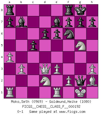 Last move : 0-1 2017 December 22 16:20:45 [Event "FICGS__CHESS__CLASS_F__000192"] [Site "FICGS"] [Date "2017.11.12"] [Round "1"] [White "Moko,Seth"] [Black "Goldmund,Heike"] [Result "0-1"] [WhiteElo "0969"] [BlackElo "1080"] 1.d4 Nf6 2.Bf4 e6 3.Nf3 b6 4.c3 Bb7 5.Nbd2 c5 6.dxc5 bxc5 7.e3 d6 8.Bd3 Be7 9.O-O Qb6 10.b3 O-O 11.Re1 Nbd7 12.h3 Nd5 13.Bh2 Nxc3 14.Qc2 Nd5 15.a4 N7f6 16.Ng5 Nb4 17.Qb2 Nxd3 18.Qc3 Qc6 19.Qxd3 Qxg2+ 0-1 Queen's pawn game Kingside Castling by player White (move 9) Kingside Castling by player Black (move 10) Player Black won this chess game. Follow this game move after move (download)Why must I lose to this idiot ? (Aron Nimzovich) Ohne ihre Erfolge schmälern zu wollen würde ich sagen Petrosian, Spassky und Karpov verdanken ihre Siege ihren Trainern - Boleslavsky, Bondarevsky und Furman. (Mikhail Moiseyevich Botvinik) ¿Cual es el objetivo de jugar una apertura de gambito?... Para adquirir una reputación de ser un jugador apuesto a costo de perder el juego. (Siegbert Tarrasch) Des idées, des idées, j'en ai cent, j'en ai mille. Des bonnes, des mauvaises, applicables, irréalisables... Il suffit de faire le tri ! (Roos) Either move or be moved. (Ezra Pound)