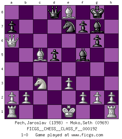 Last move : 1-0 2018 April 11 20:49:57 [Event "FICGS__CHESS__CLASS_F__000192"] [Site "FICGS"] [Date "2017.11.12"] [Round "1"] [White "Pech,Jaroslav"] [Black "Moko,Seth"] [Result "1-0"] [WhiteElo "1398"] [BlackElo "0969"] 1.c4 c6 2.d4 d5 3.Nf3 Bf5 4.Qb3 e6 5.Qxb7 Nd7 6.Bf4 Ndf6 7.Qxc6+ Nd7 8.c5 Ne7 9.Qa6 g6 10.e3 Bg7 11.Nc3 O-O 12.Bd6 e5 13.dxe5 Nxe5 14.Nxe5 Rc8 15.Bb5 Rxc5 16.Nxg6 hxg6 17.Bxc5 Re8 18.Bxe8 1-0 This chess game has been lost on time (started : 2017.11.12 18:4:43) English : Caro-Kann defensive system Kingside Castling by player Black (move 11) Player White won this chess game. Follow this game move after move (download)To avoid losing a piece, many a person has lost the game. (Savielly Tartakover) Später, ... hatte ich zunehmend Erfolg in entscheidenden Partien. Vielleicht weil ich eine einfache Wahrheit erkannte: nicht nur ich hatte Angst, auch mein Gegner. (Mikhail Nekhemyevich Tal) En el Ajedrez, tal como en la vida, las bendiciones de hoy pueden ser el veneno del mañana. (Assaic) Si le désir cupide (et stupide) de gagner est une inépuisable source de souffrance, une combinaison brillante sur l'échiquier est une découverte : le coquelicot qui s'épanouit lorsque apparaît la Voie Lactée. (Arrabal) Hold em is to stud what chess is to checkers. (Johnny Moss)