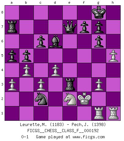 Last move : 0-1 2018 January 17 13:4:46 [Event "FICGS__CHESS__CLASS_F__000192"] [Site "FICGS"] [Date "2017.11.12"] [Round "1"] [White "Leurette,Marc-Antoine"] [Black "Pech,Jaroslav"] [Result "0-1"] [WhiteElo "1183"] [BlackElo "1398"] 1.e4 c6 2.d4 d5 3.Nc3 dxe4 4.Nxe4 Bf5 5.Nc3 e6 6.Nf3 Nf6 7.Bd3 Bd6 8.O-O Bg6 9.Bxg6 hxg6 10.h3 Qc7 11.Be3 Nbd7 12.Qd3 O-O 13.a3 b5 14.b4 Rfe8 15.Ne2 a5 16.c3 Nb6 17.g3 Nfd5 18.Kg2 Ra7 19.h4 Nc4 20.Rh1 e5 21.h5 e4 22.Qc2 Ncxe3+ 23.fxe3 Nxe3+ 24.Kf2 Nxc2 25.Rag1 exf3 26.Kxf3 Re3+ 27.Kf2 Qe7 0-1 Caro-Kann : Classical variation Kingside Castling by player White (move 8) Kingside Castling by player Black (move 12) Player Black won this chess game. Follow this game move after move (download)Chess is so inspiring that I do not believe a good player is capable of having an evil thought during the game. (Wilhelm Steinitz) Der zweitbeste Zug ist oft der einzig richtige. (Savielly Grigorievitsch Tartakower) Si tu oponente te ofrece un empate, trata de averiguar porque piensa él que esta en una posición peor. (Nigel Short) La victoire dans une partie d'Echecs appartient la plupart du temps à celui qui voit un peu plus loin que l'adversaire. (Lasker) Luck never made a man wise. (Seneca, Letters to Lucilius)