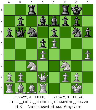 Last move : 1-0 2018 May 11 17:59:35 [Event "FICGS__CHESS__THEMATIC_TOURNAMENT__000220"] [Site "FICGS"] [Date "2017.11.12"] [Round "1"] [White "Schuett,Wilhelm"] [Black "Hilbert,Stephan J."] [Result "1-0"] [WhiteElo "1800"] [BlackElo "1674"] 1.e4 c5 2.Nf3 a6 3.c3 e6 4.d4 d5 5.e5 Qb6 6.Bd3 cxd4 7.cxd4 Bd7 8.Nc3 Nc6 9.Bb1 Nge7 10.O-O Rc8 11.Qd2 Ng6 12.Rd1 Be7 13.Ng5 O-O 14.h4 h6 15.Nf3 1-0 Sicilian : O'Kelly variation Kingside Castling by player White (move 10) Kingside Castling by player Black (move 13) Player White won this chess game. Follow this game move after move (download)One of these modest little moves may be more embarrassing to your opponent than the biggest threat. (Siegbert Tarrasch) Ich würde die 30 stärksten Spieler der USA im Simultanspiel besiegen. (José Raúl Capablanca) Estaba muy claro de que el punto vulnerable del Gran Maestro Americano (Bobby Fischer) radicaba en las posiciones de doble filo, colgantes, irracionales, donde el siempre falló en encontrar un triunfo aún en una posición de clara victoria. (Efim Geller) A ce moment-là, je menaçais de comprendre la position ! (Clément L'Heureux) Happy endings are just stories that haven't finished yet. (Jane Smith in Mr & Mrs Smith)