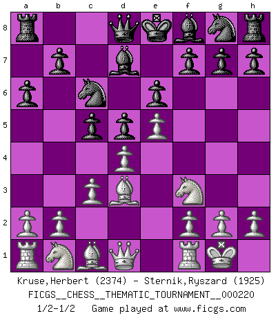 Last move : 1/2-1/2 2017 November 14 16:42:10 [Event "FICGS__CHESS__THEMATIC_TOURNAMENT__000220"] [Site "FICGS"] [Date "2017.11.12"] [Round "1"] [White "Kruse,Herbert"] [Black "Sternik,Ryszard"] [Result "1/2-1/2"] [WhiteElo "2374"] [BlackElo "1925"] 1.e4 c5 2.Nf3 a6 3.c3 e6 4.d4 d5 5.e5 Nc6 6.Bd3 Bd7 7.O-O 1/2-1/2 Sicilian : O'Kelly variation Kingside Castling by player White (move 7) This chess game ended in a draw. Follow this game move after move (download)Bobby is the most misunderstood, misquoted celebrity walking the face of this earth. (Yasser Seirawan) Ich weiss nicht was Gott gegen mich auf 1.e4 antworten würde. (Robert James Fischer) Aunque la mayoría de la gente disfruta observar las partidas de los grandes Maestros de ataque, algunos de los jugadores mas notables en la historia han sido los jugadores silenciosos posicionales. Lentamente ellos te aplastan despojandote de tu espacio, congestionando tus piezas y dejandote virtualmente sin nada que hacer. (Yasser Seirawan) Les réformistes prétendent que les progrès de la théorie conduiront à la disparition des échecs, et qu'il faut, pour leur rendre vie, en remanier les règles. En réalité, qu'exprime cette affirmation? Le mépris de l'intuition, de l'imagination et de tous les autres éléments qui font des échecs un art. (Alexander Alekhine) In my experience, there's no such thing as luck. (Obi-Wan Kenobi in Star Wars ep.4)