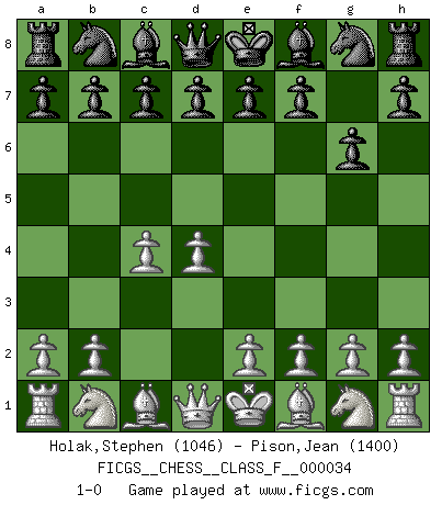Last move : 1-0 2007 May 30 17:37:21 [Event "FICGS__CHESS__CLASS_F__000034"] [Site "FICGS"] [Date "2007.04.16"] [Round "1"] [White "Holak,Stephen"] [Black "Pison,Jean"] [Result "1-0"] [WhiteElo "1046"] [BlackElo "1400"] 1.d4 g6 2.c4 1-0 This chess game has been lost on time (started : 2007.04.16 19:53:40) Modern defense Player White won this chess game. Follow this game move after move (download)There are two types of sacrifices: correct ones and mine. (Mikhail Tal) Wenn sie aufgeben, dann danke ich Ihnen für das Spiel (Eventualzug beim Fernschach). (Anonymous) Bobby solo arroja las piezas y solas caen en las casillas correctas. (Miguel Najdorf ) Vouloir jouer aux échecs contre soi-même est aussi paradoxal que vouloir marcher sur son ombre. (Stefan Zweig) A government big enough to give you everything you want is strong enough to take everything you have. (Thomas Jefferson)